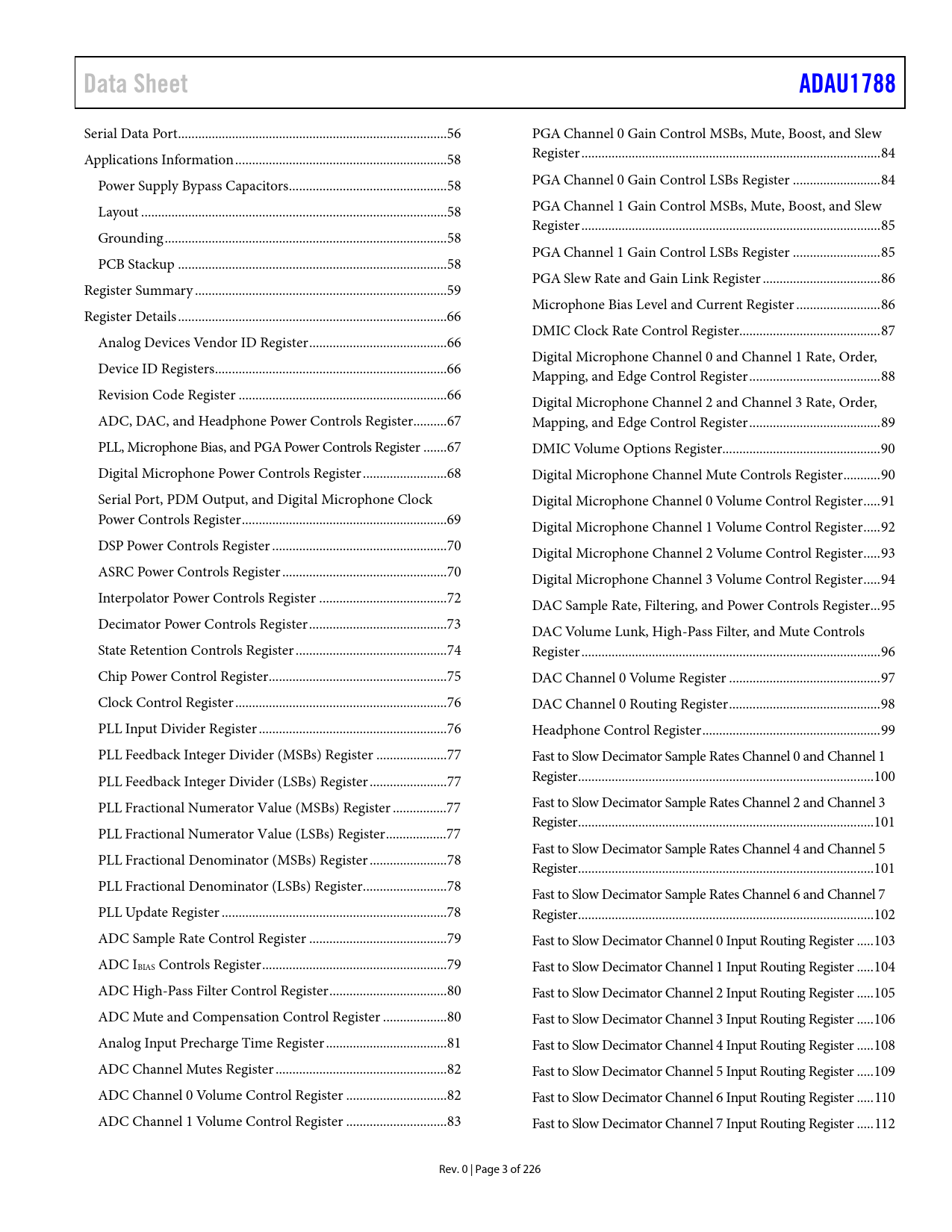 link to page 56 link to page 58 link to page 58 link to page 58 link to page 58 link to page 58 link to page 59 link to page 66 link to page 66 link to page 66 link to page 66 link to page 67 link to page 67 link to page 68 link to page 69 link to page 69 link to page 70 link to page 70 link to page 72 link to page 73 link to page 74 link to page 75 link to page 76 link to page 76 link to page 77 link to page 77 link to page 77 link to page 77 link to page 78 link to page 78 link to page 78 link to page 79 link to page 79 link to page 80 link to page 80 link to page 81 link to page 82 link to page 82 link to page 83 link to page 84 link to page 84 link to page 84 link to page 85 link to page 85 link to page 85 link to page 86 link to page 86 link to page 87 link to page 88 link to page 88 link to page 89 link to page 89 link to page 90 link to page 90 link to page 91 link to page 92 link to page 93 link to page 94 link to page 95 link to page 96 link to page 96 link to page 97 link to page 98 link to page 99 link to page 100 link to page 100 link to page 101 link to page 101 link to page 101 link to page 101 link to page 102 link to page 102 link to page 103 link to page 104 link to page 105 link to page 106 link to page 108 link to page 109 link to page 110 link to page 112 Data SheetADAU1788 Serial Data Port .. 56 PGA Channel 0 Gain Control MSBs, Mute, Boost, and Slew Applications Information ... 58 Register ... 84 Power Supply Bypass Capacitors ... 58 PGA Channel 0 Gain Control LSBs Register .. 84 Layout ... 58 PGA Channel 1 Gain Control MSBs, Mute, Boost, and Slew Register ... 85 Grounding .. 58 PGA Channel 1 Gain Control LSBs Register .. 85 PCB Stackup .. 58 PGA Slew Rate and Gain Link Register ... 86 Register Summary ... 59 Microphone Bias Level and Current Register ... 86 Register Details .. 66 DMIC Clock Rate Control Register.. 87 Analog Devices Vendor ID Register ... 66 Digital Microphone Channel 0 and Channel 1 Rate, Order, Device ID Registers ... 66 Mapping, and Edge Control Register ... 88 Revision Code Register .. 66 Digital Microphone Channel 2 and Channel 3 Rate, Order, ADC, DAC, and Headphone Power Controls Register.. 67 Mapping, and Edge Control Register ... 89 PLL, Microphone Bias, and PGA Power Controls Register ... 67 DMIC Volume Options Register... 90 Digital Microphone Power Controls Register ... 68 Digital Microphone Channel Mute Controls Register ... 90 Serial Port, PDM Output, and Digital Microphone Clock Digital Microphone Channel 0 Volume Control Register ... 91 Power Controls Register ... 69 Digital Microphone Channel 1 Volume Control Register ... 92 DSP Power Controls Register .. 70 Digital Microphone Channel 2 Volume Control Register ... 93 ASRC Power Controls Register ... 70 Digital Microphone Channel 3 Volume Control Register ... 94 Interpolator Power Controls Register .. 72 DAC Sample Rate, Filtering, and Power Controls Register... 95 Decimator Power Controls Register ... 73 DAC Volume Lunk, High-Pass Filter, and Mute Controls State Retention Controls Register ... 74 Register ... 96 Chip Power Control Register ... 75 DAC Channel 0 Volume Register ... 97 Clock Control Register ... 76 DAC Channel 0 Routing Register ... 98 PLL Input Divider Register .. 76 Headphone Control Register ... 99 PLL Feedback Integer Divider (MSBs) Register ... 77 Fast to Slow Decimator Sample Rates Channel 0 and Channel 1 PLL Feedback Integer Divider (LSBs) Register ... 77 Register .. 100 PLL Fractional Numerator Value (MSBs) Register .. 77 Fast to Slow Decimator Sample Rates Channel 2 and Channel 3 Register .. 101 PLL Fractional Numerator Value (LSBs) Register .. 77 Fast to Slow Decimator Sample Rates Channel 4 and Channel 5 PLL Fractional Denominator (MSBs) Register ... 78 Register .. 101 PLL Fractional Denominator (LSBs) Register ... 78 Fast to Slow Decimator Sample Rates Channel 6 and Channel 7 PLL Update Register ... 78 Register .. 102 ADC Sample Rate Control Register ... 79 Fast to Slow Decimator Channel 0 Input Routing Register ... 103 ADC IBIAS Controls Register ... 79 Fast to Slow Decimator Channel 1 Input Routing Register ... 104 ADC High-Pass Filter Control Register ... 80 Fast to Slow Decimator Channel 2 Input Routing Register ... 105 ADC Mute and Compensation Control Register ... 80 Fast to Slow Decimator Channel 3 Input Routing Register ... 106 Analog Input Precharge Time Register .. 81 Fast to Slow Decimator Channel 4 Input Routing Register ... 108 ADC Channel Mutes Register ... 82 Fast to Slow Decimator Channel 5 Input Routing Register ... 109 ADC Channel 0 Volume Control Register .. 82 Fast to Slow Decimator Channel 6 Input Routing Register ... 110 ADC Channel 1 Volume Control Register .. 83 Fast to Slow Decimator Channel 7 Input Routing Register ... 112 Rev. 0 | Page 3 of 226 Document Outline FEATURES APPLICATIONS GENERAL DESCRIPTION TABLE OF CONTENTS REVISION HISTORY FUNCTIONAL BLOCK DIAGRAM SPECIFICATIONS ANALOG PERFORMANCE SPECIFICATIONS CRYSTAL AMPLIFIER SPECIFICATIONS DIGITAL INPUT AND OUTPUT SPECIFICATIONS POWER SUPPLY SPECIFICATIONS POWER-DOWN CURRENT TYPICAL POWER CONSUMPTION DIGITAL FILTERS DIGITAL TIMING SPECIFICATIONS Digital Timing Diagrams ABSOLUTE MAXIMUM RATINGS THERMAL RESISTANCE ESD CAUTION PIN CONFIGURATION AND FUNCTION DESCRIPTIONS TYPICAL PERFORMANCE CHARACTERISTICS SYSTEM BLOCK DIAGRAM THEORY OF OPERATION SYSTEM CLOCKING AND POWER-UP POWER-DOWN OPERATION AND OPTIONS EXAMPLE ADC TO DAC POWER-UP DVDD LDO REGULATOR CLOCK INITIALIZATION PLL Enabled Setup Control Port Access During Initialization PLL PLL Bypass Operation Input Clock Divider Integer Mode Fractional Mode MULTICHIP PHASE SYNCHRONIZATION CLOCK OUTPUT POWER SUPPLY SEQUENCING Power-Down Considerations SIGNAL ROUTING INPUT SIGNAL PATHS ANALOG INPUTS Phase Difference Various Signal Path ADAU1788 Input Impedance Analog Microphone Inputs Analog Line Inputs Precharging Input Capacitors Microphone Bias PGAs DIGITAL MICROPHONE INPUTS Digital Microphone Volume Control ADCs ADC Full-Scale Level D