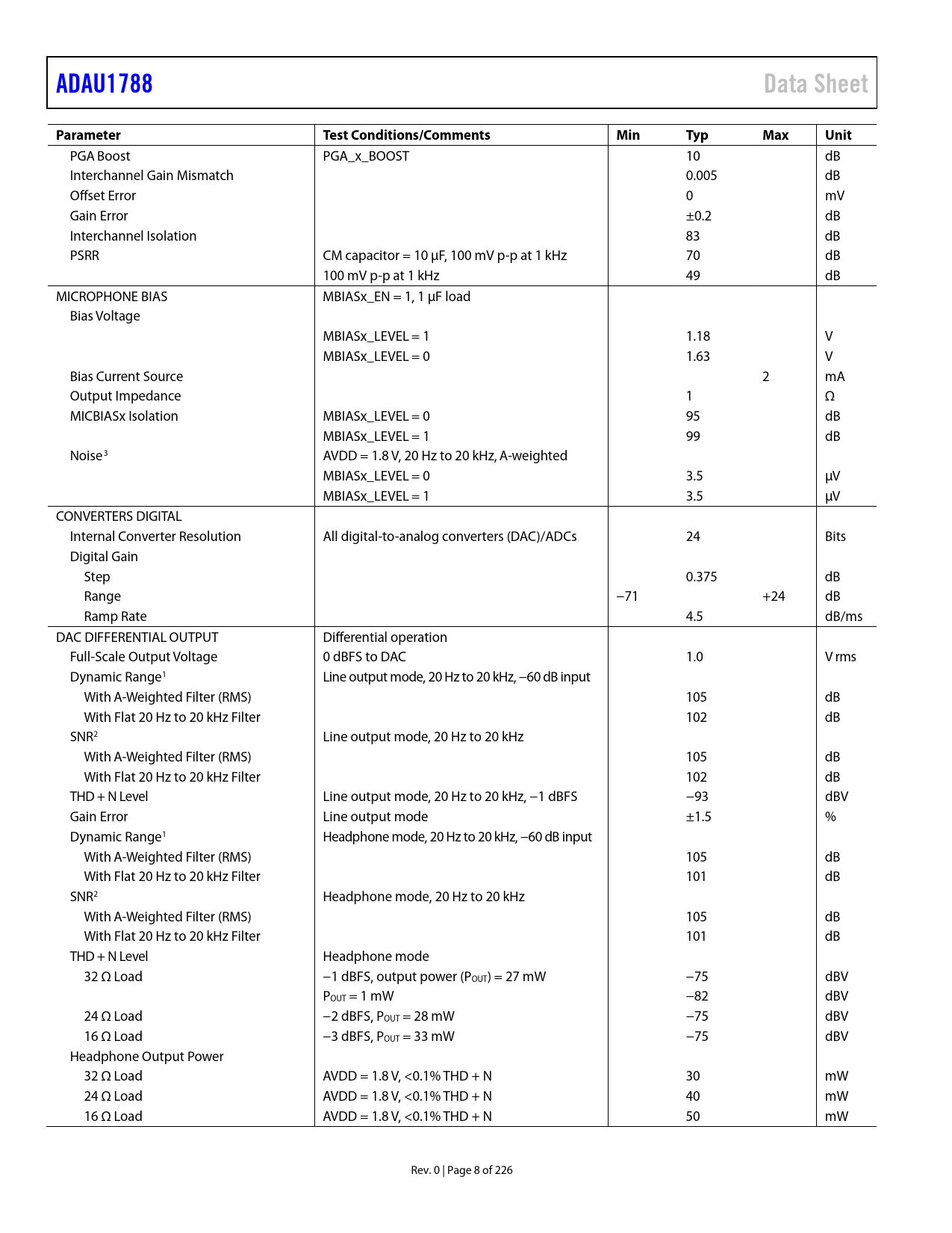 link to page 9 link to page 9 link to page 9 ADAU1788Data SheetParameterTest Conditions/CommentsMinTypMaxUnit PGA Boost PGA_x_BOOST 10 dB Interchannel Gain Mismatch 0.005 dB Offset Error 0 mV Gain Error ±0.2 dB Interchannel Isolation 83 dB PSRR CM capacitor = 10 μF, 100 mV p-p at 1 kHz 70 dB 100 mV p-p at 1 kHz 49 dB MICROPHONE BIAS MBIASx_EN = 1, 1 µF load Bias Voltage MBIASx_LEVEL = 1 1.18 V MBIASx_LEVEL = 0 1.63 V Bias Current Source 2 mA Output Impedance 1 Ω MICBIASx Isolation MBIASx_LEVEL = 0 95 dB MBIASx_LEVEL = 1 99 dB Noise3 AVDD = 1.8 V, 20 Hz to 20 kHz, A-weighted MBIASx_LEVEL = 0 3.5 µV MBIASx_LEVEL = 1 3.5 µV CONVERTERS DIGITAL Internal Converter Resolution All digital-to-analog converters (DAC)/ADCs 24 Bits Digital Gain Step 0.375 dB Range −71 +24 dB Ramp Rate 4.5 dB/ms DAC DIFFERENTIAL OUTPUT Differential operation Ful -Scale Output Voltage 0 dBFS to DAC 1.0 V rms Dynamic Range1 Line output mode, 20 Hz to 20 kHz, −60 dB input With A-Weighted Filter (RMS) 105 dB With Flat 20 Hz to 20 kHz Filter 102 dB SNR2 Line output mode, 20 Hz to 20 kHz With A-Weighted Filter (RMS) 105 dB With Flat 20 Hz to 20 kHz Filter 102 dB THD + N Level Line output mode, 20 Hz to 20 kHz, −1 dBFS −93 dBV Gain Error Line output mode ±1.5 % Dynamic Range1 Headphone mode, 20 Hz to 20 kHz, −60 dB input With A-Weighted Filter (RMS) 105 dB With Flat 20 Hz to 20 kHz Filter 101 dB SNR2 Headphone mode, 20 Hz to 20 kHz With A-Weighted Filter (RMS) 105 dB With Flat 20 Hz to 20 kHz Filter 101 dB THD + N Level Headphone mode 32 Ω Load −1 dBFS, output power (POUT) = 27 mW −75 dBV POUT = 1 mW −82 dBV 24 Ω Load −2 dBFS, POUT = 28 mW −75 dBV 16 Ω Load −3 dBFS, POUT = 33 mW −75 dBV Headphone Output Power 32 Ω Load AVDD = 1.8 V, <0.1% THD + N 30 mW 24 Ω Load AVDD = 1.8 V, <0.1% THD + N 40 mW 16 Ω Load AVDD = 1.8 V, <0.1% THD + N 50 mW Rev. 0 | Page 8 of 226 Document Outline FEATURES APPLICATIONS GENERAL DESCRIPTION TABLE OF CONTENTS REVISION HISTORY FUNCTIONAL BLOCK DIAGRAM SPECIFICATIONS ANALOG PERFORMANCE SPECIFICATIONS CRYSTAL AMPLIFIER SPECIFICATIONS DIGITAL INPUT AND OUTPUT SPECIFICATIONS POWER SUPPLY SPECIFICATIONS POWER-DOWN CURRENT TYPICAL POWER CONSUMPTION DIGITAL FILTERS DIGITAL TIMING SPECIFICATIONS Digital Timing Diagrams ABSOLUTE MAXIMUM RATINGS THERMAL RESISTANCE ESD CAUTION PIN CONFIGURATION AND FUNCTION DESCRIPTIONS TYPICAL PERFORMANCE CHARACTERISTICS SYSTEM BLOCK DIAGRAM THEORY OF OPERATION SYSTEM CLOCKING AND POWER-UP POWER-DOWN OPERATION AND OPTIONS EXAMPLE ADC TO DAC POWER-UP DVDD LDO REGULATOR CLOCK INITIALIZATION PLL Enabled Setup Control Port Access During Initialization PLL PLL Bypass Operation Input Clock Divider Integer Mode Fractional Mode MULTICHIP PHASE SYNCHRONIZATION CLOCK OUTPUT POWER SUPPLY SEQUENCING Power-Down Considerations SIGNAL ROUTING INPUT SIGNAL PATHS ANALOG INPUTS Phase Difference Various Signal Path ADAU1788 Input Impedance Analog Microphone Inputs Analog Line Inputs Precharging Input Capacitors Microphone Bias PGAs DIGITAL MICROPHONE INPUTS Digital Microphone Volume Control ADCs ADC Full-Scale Level Digital ADC Volume Control Filtering OUTPUT SIGNAL PATHS ANALOG OUTPUTS Headphone Output Line Output Pop and Click Suppression DAC DAC Full-Scale Level Digital DAC Volume Control and Filtering PDM OUTPUTS PDM Outputs Full-Scale Level PDM Outputs Volume Control and Filtering ASRCs INTERPOLATION AND DECIMATION BLOCKS SIGNAL LEVELS FastDSP CORE INSTRUCTIONS FILTER PRECISION FLAGS AND CONDITIONAL EXECUTION INPUT SOURCES POWER AND RUN CONTROL DATA MEMORY PARAMETERS PARAMETER BANK SWITCHING PARAMETER BANK COPYING PARAMETER MEMORY ACCESS FastDSP PARAMETER SAFELOAD SigmaDSP CORE SIGNAL PROCESSING DETAILS Program Counter Watchdog Features Numeric Formats Numeric Format 5.23 Programming READ/WRITE DATA FORMATS SOFTWARE SAFELOAD FastDSP SAFELOAD PROGRAM RAM, PARAMETER RAM, AND DATA RAM PROGRAM RAM PARAMETER RAM DATA RAM POWER SAVING OPTIONS ADC BIAS CURRENT CONTROL DAC BIAS CURRENT CONTROL DAC LOW POWER MODES PLL BYPASS SigmaDSP CLOCK SPEED CONTROL ASYNCHRONOUS SAMPLE RATE CONVERTERS LOW POWER MODES CONTROL PORT BURST MODE COMMUNICATION READING AND WRITING TO MEMORIES I2C PORT Addressing I2C Read and Write Operations SPI PORT R/ Subaddress Data Bytes MULTIPURPOSE PINS Interrupts Pin Controls SERIAL DATA PORT APPLICATIONS INFORMATION POWER SUPPLY BYPASS CAPACITORS LAYOUT GROUNDING PCB STACKUP REGISTER SUMMARY REGISTER DETAILS ANALOG DEVICES VENDOR ID REGISTER DEVICE ID REGISTERS REVISION CODE REGISTER ADC, DAC, AND HEADPHONE POWER CONTROLS REGISTER PLL, MICROPHONE BIAS, AND PGA POWER CONTROLS REGISTER DIGITAL MICROPHONE POWER CONTROLS REGISTER SERIAL PORT, PDM OUTPUT, AND DIGITAL MICROPHONE CLOCK POWER CONTROLS REGISTER DSP POWER CONTROLS REGISTER ASRC POWER CONTROLS REGISTER INTERPOLATOR POWER CONTROLS REGISTER DECIMATOR POWER CONTROLS REGISTER STATE RETENTION CONTROLS REGISTER CHIP POWER CONTROL REGISTER CLOCK CONTROL REGISTER PLL INPUT DIVIDER REGISTER PLL FEEDBACK INTEGER DIVIDER (MSBs) REGISTER PLL FEEDBACK INTEGER DIVIDER (LSBs) REGISTER PLL FRACTIONAL NUMERATOR VALUE (MSBs) REGISTER PLL FRACTIONAL NUMERATOR VALUE (LSBs) REGISTER PLL FRACTIONAL DENOMINATOR (MSBs) REGISTER PLL FRACTIONAL DENOMINATOR (LSBs) REGISTER PLL UPDATE REGISTER ADC SAMPLE RATE CONTROL REGISTER ADC IBIAS CONTROLS REGISTER ADC HIGH-PASS FILTER CONTROL REGISTER ADC MUTE AND COMPENSATION CONTROL REGISTER ANALOG INPUT PRECHARGE TIME REGISTER ADC CHANNEL MUTES REGISTER ADC CHANNEL 0 VOLUME CONTROL REGISTER ADC CHANNEL 1 VOLUME CONTROL REGISTER PGA CHANNEL 0 GAIN CONTROL MSBs, MUTE, BOOST, AND SLEW REGISTER PGA CHANNEL 0 GAIN CONTROL LSBs REGISTER PGA CHANNEL 1 GAIN CONTROL MSBs, MUTE, BOOST, AND SLEW REGISTER PGA CHANNEL 1 GAIN CONTROL LSBs REGISTER PGA SLEW RATE AND GAIN LINK REGISTER MICROPHONE BIAS LEVEL AND CURRENT REGISTER DMIC CLOCK RATE CONTROL REGISTER DIGITAL MICROPHONE CHANNEL 0 AND CHANNEL 1 RATE, ORDER, MAPPING, AND EDGE CONTROL REGISTER DIGITAL MICROPHONE CHANNEL 2 AND C