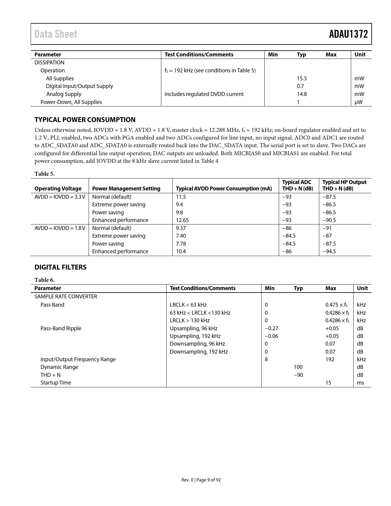 Data Sheet ADAU1372 Parameter Test Conditions/Comments Min Typ Max Unit TYPICAL POWER CONSUMPTION Table 5 Typical ADC