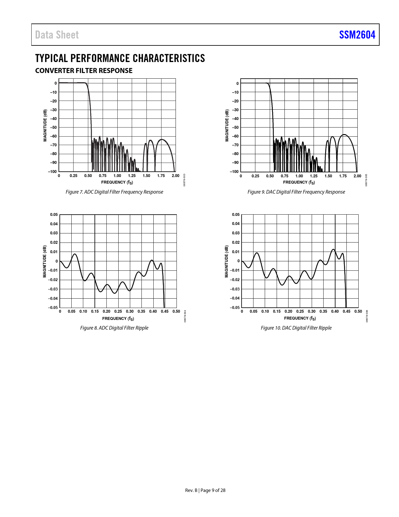 Data SheetSSM2604TYPICAL PERFORMANCE CHARACTERISTICS CONVERTER FILTER RESPONSE00–10–10–20–20–30–30B)B)dd(–40(–40UDEUDET–50T–50NINIAG–60AG–60MM–70–70–80–80–90–90–100–10000.250.500.751.001.251.501.752.0000.250.500.751.001.251.501.752.00 003 005 FREQUENCY (fS)FREQUENCY (fS) 06978- 06978- Figure 7. ADC Digital Filter Frequency Response Figure 9. DAC Digital Filter Frequency Response 0.050.050.040.040.030.030.020.02B)B)dd(0.01(0.01UDE0UDE0TTNINI−0.01−0.01AGAGMM−0.02−0.02−0.03−0.03−0.04−0.04−0.05−0.0500.050.100.150.200.250.300.350.400.450.5000.050.100.150.200.250.300.350.400.450.50 004 006 FREQUENCY (fS)FREQUENCY (fS) 06978- 06978- Figure 8. ADC Digital Filter Ripple Figure 10. DAC Digital Filter Ripple Rev. B | Page 9 of 28 Document Outline Features Applications General Description Functional Block Diagram Revision History Specifications Digital Filter Characteristics Timing Characteristics Absolute Maximum Ratings Thermal Resistance ESD Caution Pin Configuration and Function Descriptions Typical Performance Characteristics Converter Filter Response Digital De-Emphasis Theory of Operation Digital Core ADC and DAC ADC High-Pass and DAC De-Emphasis Filters Analog Interface Signal Chain Stereo Line Inputs Bypass Path to Output Line Outputs Digital Audio Interface Recording Mode Playback Mode Digital Audio Data Sampling Rate Software Control Interface Control Register Sequencing Typical Application Circuits Register Map Register Map Details Left-Channel ADC Input Volume, Address 0x00 Right-Channel ADC Input Volume, Address 0x01 Analog Audio Path, Address 0x04 Digital Audio Path, Address 0x05 Power Management, Address 0x06 Power Consumption Digital Audio I/F, Address 0x07 Sampling Rate, Address 0x08 Active, Address 0x09 Software Reset, Address 0x0F Outline Dimensions Ordering Guide