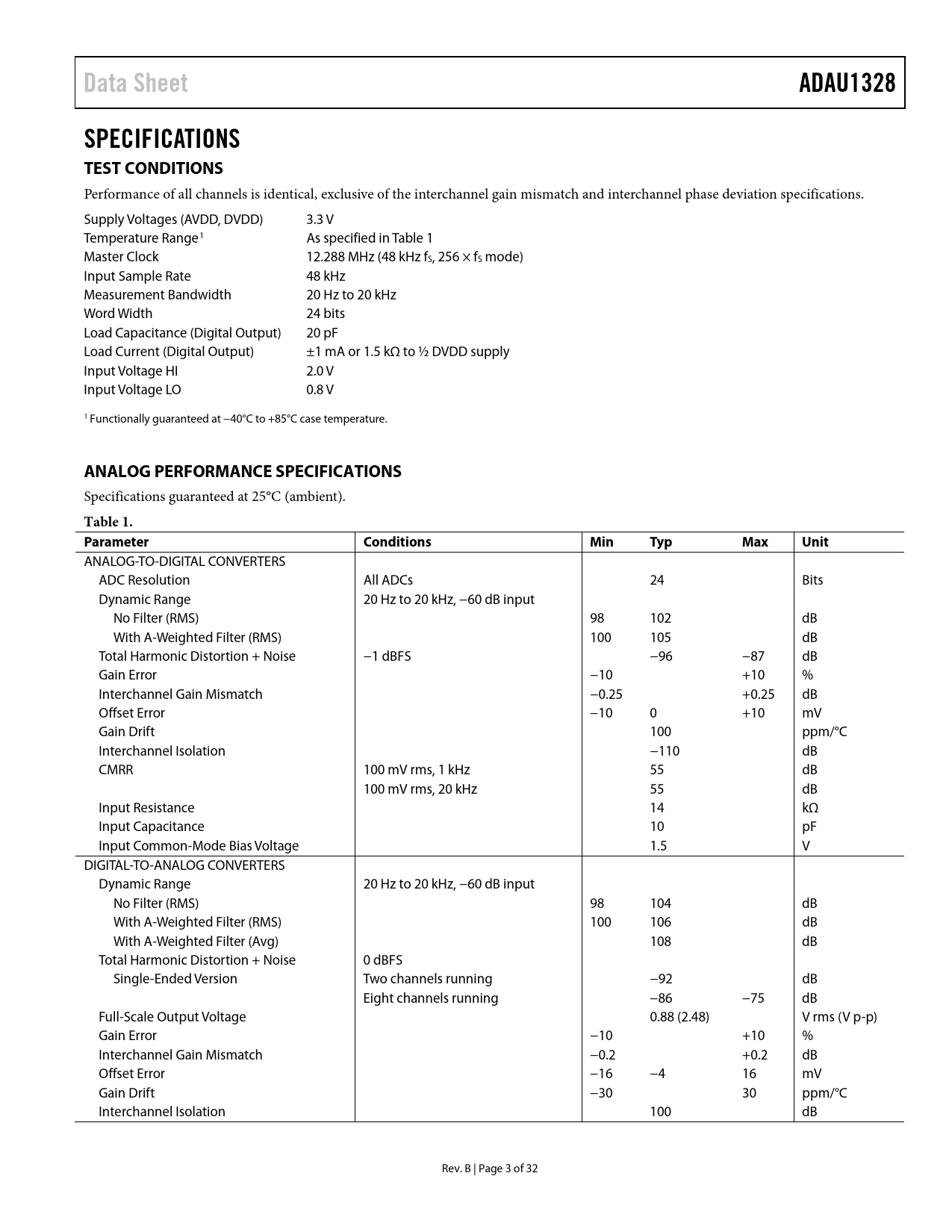 Data Sheet ADAU1328 SPECIFICATIONS TEST CONDITIONS