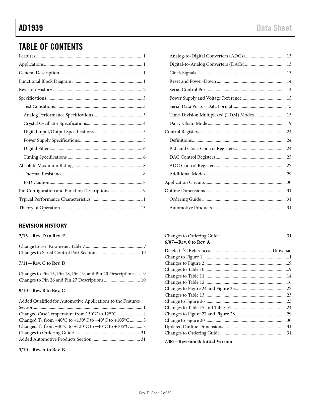 link to page 1 link to page 1 link to page 1 link to page 1 link to page 2 link to page 3 link to page 3 link to page 3 link to page 4 link to page 5 link to page 5 link to page 6 link to page 6 link to page 8 link to page 8 link to page 8 link to page 9 link to page 11 link to page 13 link to page 13 link to page 13 link to page 13 link to page 14 link to page 14 link to page 15 link to page 15 link to page 15 link to page 19 link to page 24 link to page 24 link to page 24 link to page 25 link to page 27 link to page 29 link to page 30 link to page 31 link to page 31 link to page 31 AD1939Data SheetTABLE OF CONTENTS Features .. 1 Analog-to-Digital Converters (ADCs) .. 13 Applications ... 1 Digital-to-Analog Converters (DACs) .. 13 General Description ... 1 Clock Signals ... 13 Functional Block Diagram .. 1 Reset and Power-Down ... 14 Revision History ... 2 Serial Control Port ... 14 Specifications ... 3 Power Supply and Voltage Reference ... 15 Test Conditions ... 3 Serial Data Ports—Data Format ... 15 Analog Performance Specifications ... 3 Time-Division Multiplexed (TDM) Modes .. 15 Crystal Oscillator Specifications... 4 Daisy-Chain Mode ... 19 Digital Input/Output Specifications... 5 Control Registers .. 24 Power Supply Specifications.. 5 Definitions ... 24 Digital Filters ... 6 PLL and Clock Control Registers ... 24 Timing Specifications .. 6 DAC Control Registers .. 25 Absolute Maximum Ratings .. 8 ADC Control Registers .. 27 Thermal Resistance .. 8 Additional Modes ... 29 ESD Caution .. 8 Application Circuits ... 30 Pin Configuration and Function Descriptions ... 9 Outline Dimensions ... 31 Typical Performance Characteristics ... 11 Ordering Guide .. 31 Theory of Operation .. 13 Automotive Products ... 31 REVISION HISTORY2/13—Rev. D to Rev. E Changes to Ordering Guide .. 31 6/07—Rev. 0 to Rev. A Change to tCLH Parameter, Table 7 ... 7 Changes to Serial Control Port Section .. 14 Deleted I2C References... Universal Change to Figure 1 .. 1 7/11—Rev. C to Rev. D Changes to Figure 2 ... 9 Changes to Table 10 .. 9 Changes to Pin 15, Pin 18, Pin 19, and Pin 20 Descriptions .. 9 Changes to Table 11 ... 14 Changes to Pin 26 and Pin 27 Descriptions .. 10 Changes to Table 12 ... 16 9/10—Rev. B to Rev. C Changes to Figure 24 and Figure 25... 22 Changes to Table 13 ... 23 Added Qualified for Automotive Applications to the Features Change to Figure 26 ... 23 Section .. 1 Changes to Table 15 and Table 16 .. 24 Changed Case Temperature from 130°C to 125°C .. 4 Changes to Figure 27 and Figure 28... 29 Changed TA from −40°C to +130°C to −40°C to +105°C ... 5 Change to Figure 30 ... 30 Changed TA from −40°C to +130°C to −40°C to +105°C ... 7 Updated Outline Dimensions ... 31 Changes to Ordering Guide .. 31 Changes to Ordering Guide .. 31 Added Automotive Products Section .. 31 7/06—Revision 0: Initial Version3/10—Rev. A to Rev. B Rev. E | Page 2 of 32 Document Outline Features Applications General Description Functional Block Diagram Revision History Specifications Test Conditions Analog Performance Specifications Crystal Oscillator Specifications Digital Input/Output Specifications Power Supply Specifications Digital Filters Timing Specifications Absolute Maximum Ratings Thermal Resistance ESD Caution Pin Configuration and Function Descriptions Typical Performance Characteristics Theory of Operation Analog-to-Digital Converters (ADCs) Digital-to-Analog Converters (DACs) Clock Signals Reset and Power-Down Serial Control Port Power Supply and Voltage Reference Serial Data Ports—Data Format Time-Division Multiplexed (TDM) Modes Daisy-Chain Mode Control Registers Definitions PLL and Clock Control Registers DAC Control Registers ADC Control Registers Additional Modes Application Circuits Outline Dimensions Ordering Guide Automotive Products