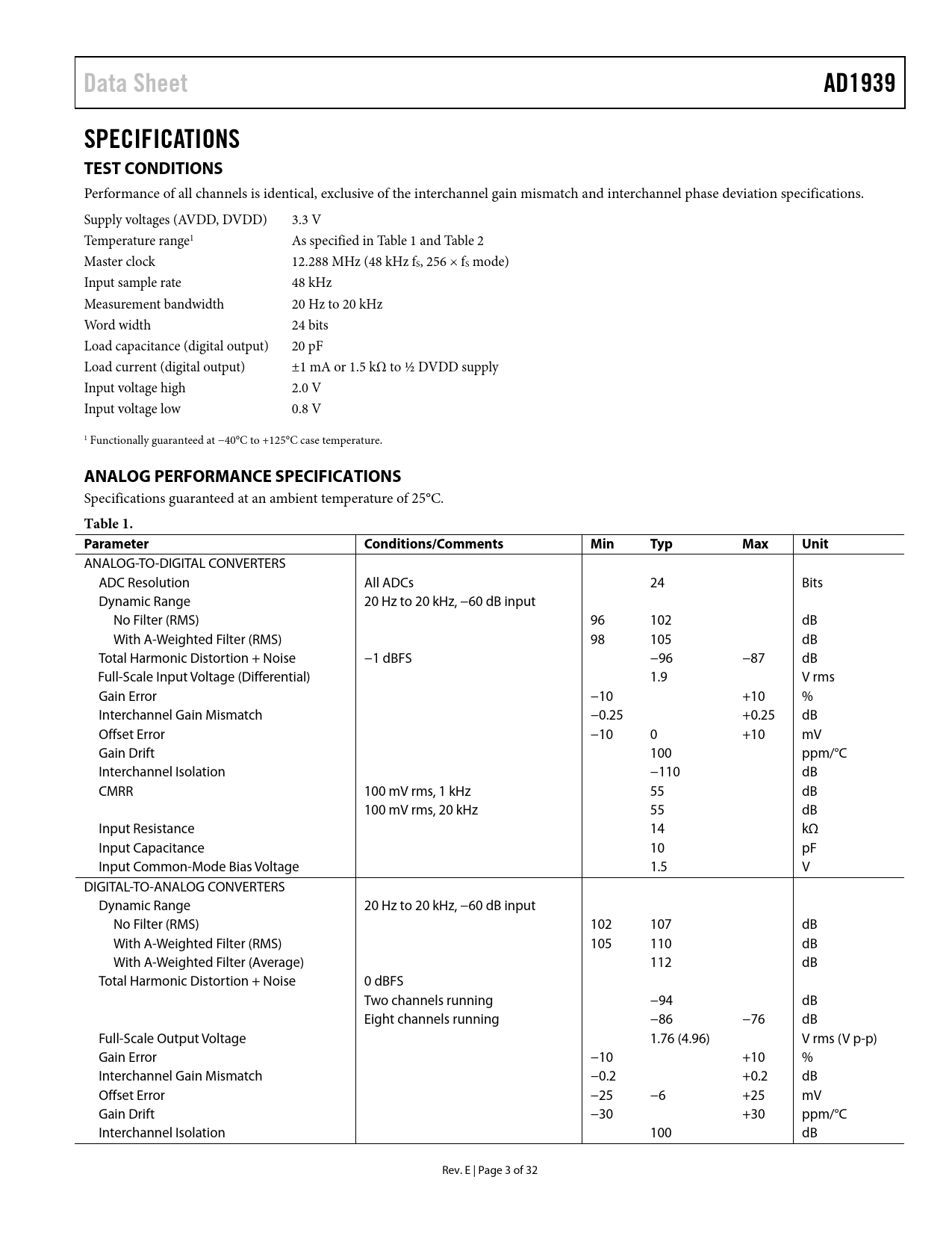 页数 / 页32 / 3 — Data Sheet. AD1939. SPECIFICATIONS TEST CONDITIONS. ANALOG PERFORMANCE …