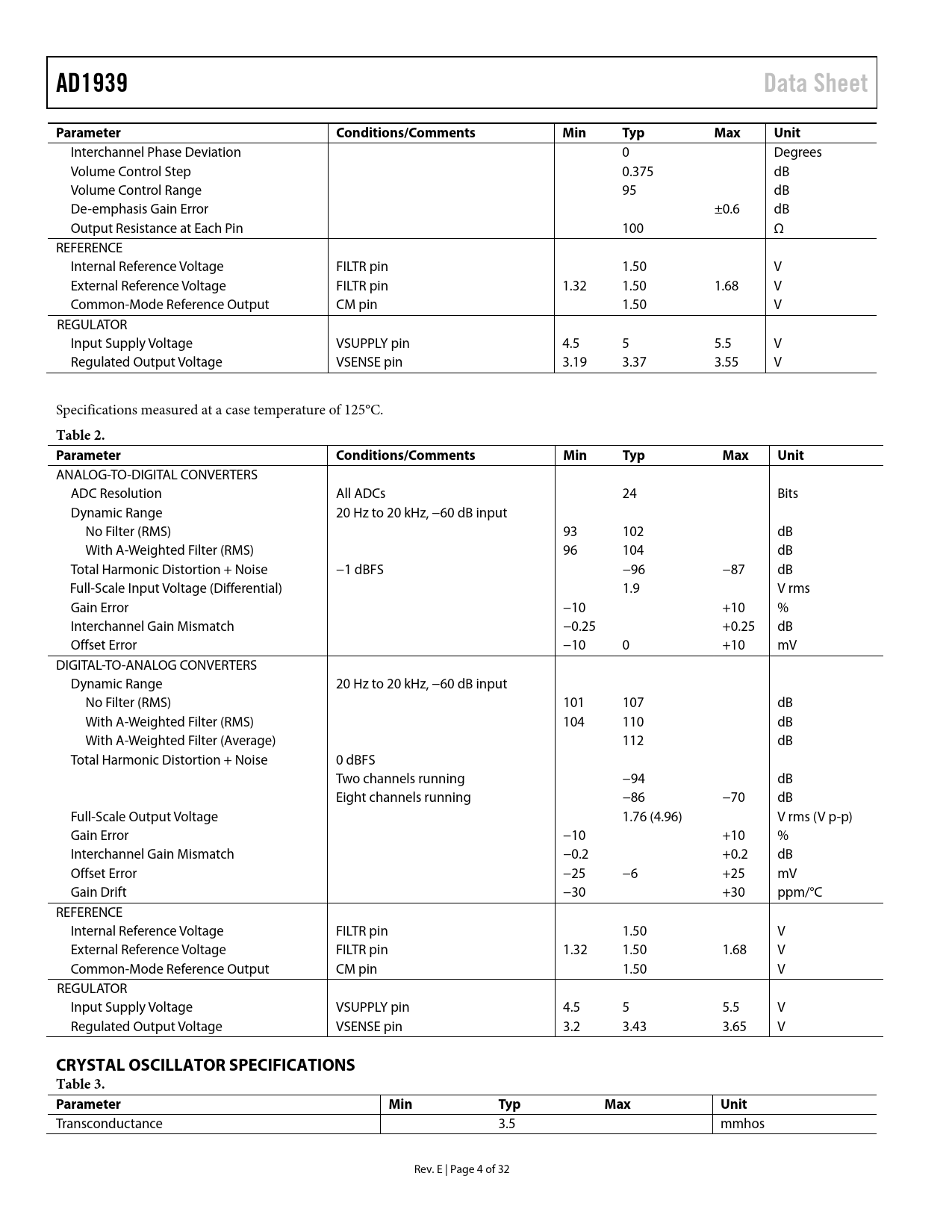 AD1939Data SheetParameterConditions/CommentsMinTypMaxUnit Interchannel Phase Deviation 0 Degrees Volume Control Step 0.375 dB Volume Control Range 95 dB De-emphasis Gain Error ±0.6 dB Output Resistance at Each Pin 100 Ω REFERENCE Internal Reference Voltage FILTR pin 1.50 V External Reference Voltage FILTR pin 1.32 1.50 1.68 V Common-Mode Reference Output CM pin 1.50 V REGULATOR Input Supply Voltage VSUPPLY pin 4.5 5 5.5 V Regulated Output Voltage VSENSE pin 3.19 3.37 3.55 V Specifications measured at a case temperature of 125°C. Table 2. ParameterConditions/CommentsMinTypMaxUnit ANALOG-TO-DIGITAL CONVERTERS ADC Resolution All ADCs 24 Bits Dynamic Range 20 Hz to 20 kHz, −60 dB input No Filter (RMS) 93 102 dB With A-Weighted Filter (RMS) 96 104 dB Total Harmonic Distortion + Noise −1 dBFS −96 −87 dB Full-Scale Input Voltage (Differential) 1.9 V rms Gain Error −10 +10 % Interchannel Gain Mismatch −0.25 +0.25 dB Offset Error −10 0 +10 mV DIGITAL-TO-ANALOG CONVERTERS Dynamic Range 20 Hz to 20 kHz, −60 dB input No Filter (RMS) 101 107 dB With A-Weighted Filter (RMS) 104 110 dB With A-Weighted Filter (Average) 112 dB Total Harmonic Distortion + Noise 0 dBFS Two channels running −94 dB Eight channels running −86 −70 dB Full-Scale Output Voltage 1.76 (4.96) V rms (V p-p) Gain Error −10 +10 % Interchannel Gain Mismatch −0.2 +0.2 dB Offset Error −25 −6 +25 mV Gain Drift −30 +30 ppm/°C REFERENCE Internal Reference Voltage FILTR pin 1.50 V External Reference Voltage FILTR pin 1.32 1.50 1.68 V Common-Mode Reference Output CM pin 1.50 V REGULATOR Input Supply Voltage VSUPPLY pin 4.5 5 5.5 V Regulated Output Voltage VSENSE pin 3.2 3.43 3.65 V CRYSTAL OSCILLATOR SPECIFICATIONS Table 3. ParameterMinTypMaxUnit Transconductance 3.5 mmhos Rev. E | Page 4 of 32 Document Outline Features Applications General Description Functional Block Diagram Revision History Specifications Test Conditions Analog Performance Specifications Crystal Oscillator Specifications Digital Input/Output Specifications Power Supply Specifications Digital Filters Timing Specifications Absolute Maximum Ratings Thermal Resistance ESD Caution Pin Configuration and Function Descriptions Typical Performance Characteristics Theory of Operation Analog-to-Digital Converters (ADCs) Digital-to-Analog Converters (DACs) Clock Signals Reset and Power-Down Serial Control Port Power Supply and Voltage Reference Serial Data Ports—Data Format Time-Division Multiplexed (TDM) Modes Daisy-Chain Mode Control Registers Definitions PLL and Clock Control Registers DAC Control Registers ADC Control Registers Additional Modes Application Circuits Outline Dimensions Ordering Guide Automotive Products