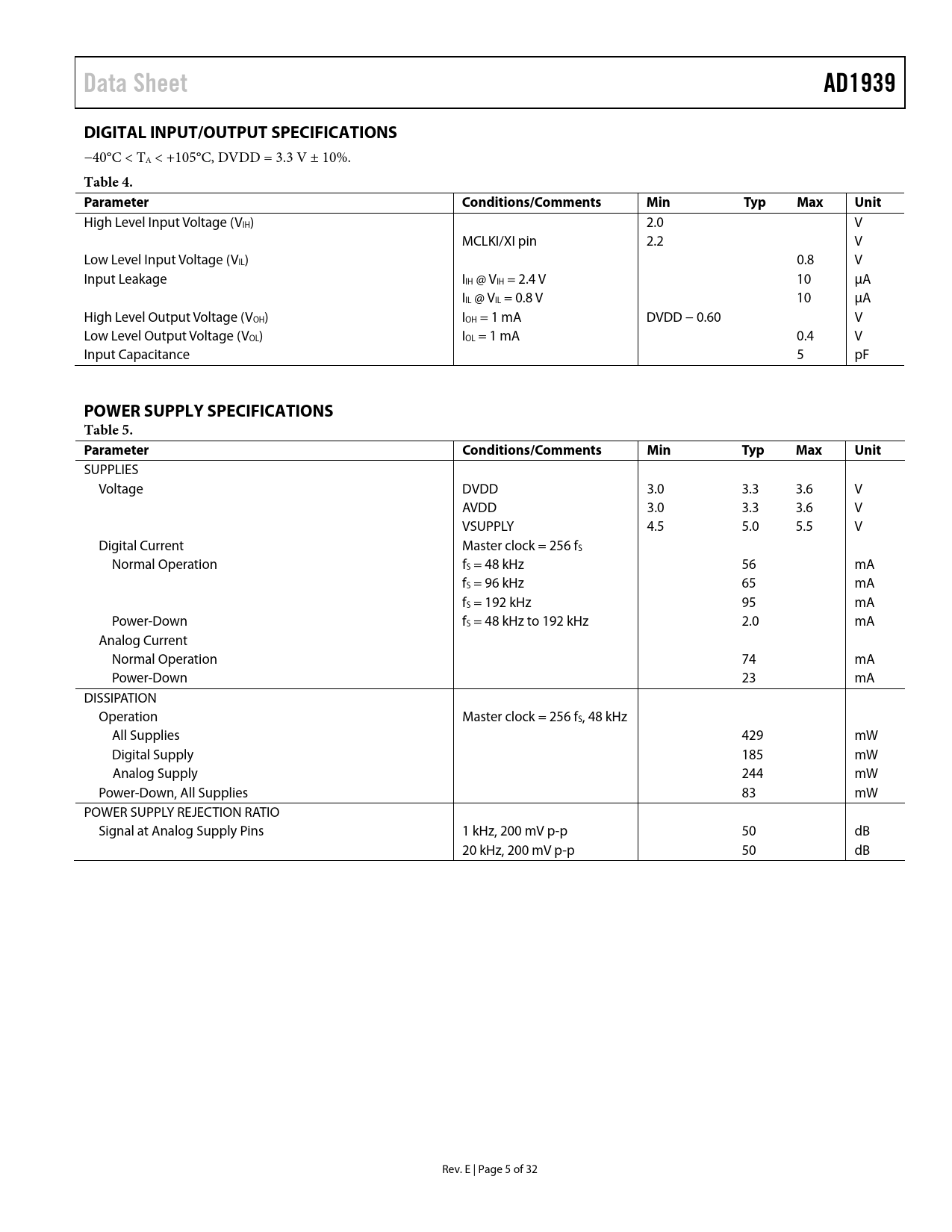 页数 / 页32 / 5 — Data Sheet. AD1939. DIGITAL INPUT/OUTPUT SPECIFICATIONS. Table 4. …
