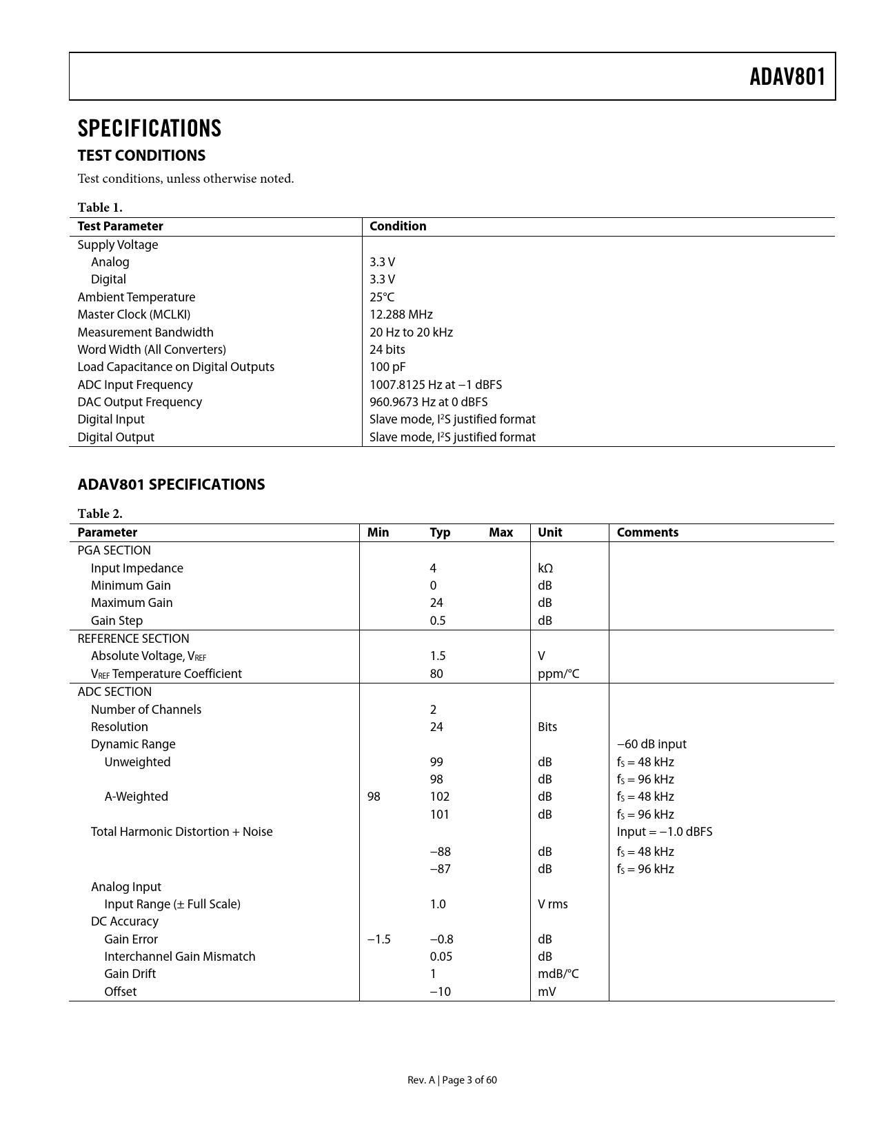 | 页数 / 页 | 60 / 3 — ADAV801. SPECIFICATIONS TEST CONDITIONS. Table 1. Test Parameter. … |