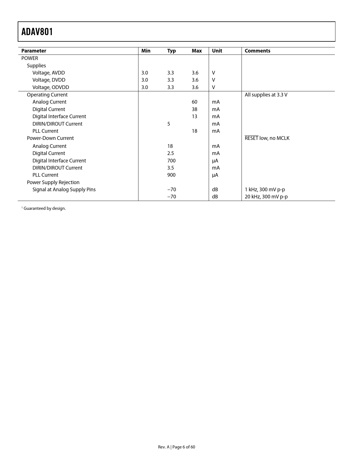 | 页数 / 页 | 60 / 6 — ADAV801. Parameter Min. Typ. Max. Unit. Comments |