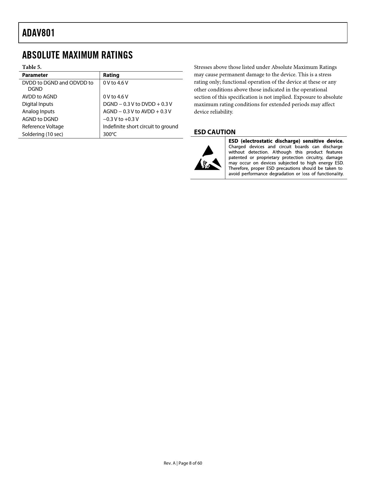 页数 / 页60 / 8 — ADAV801. ABSOLUTE MAXIMUM RATINGS Table 5. Parameter Rating. ESD CAUTION