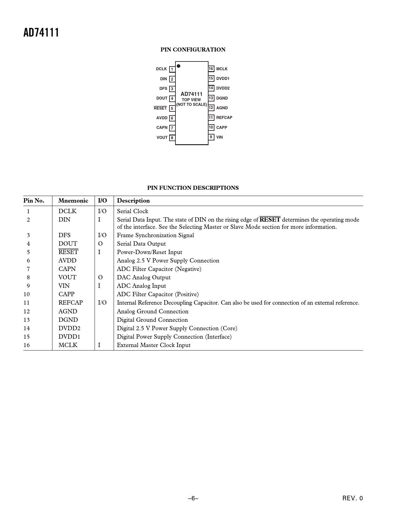 AD74111. PIN CONFIGURATION. DCLK. 16 MCLK. DIN. 15 DVDD1. DFS. 14 DVDD2. DOUT 4. 13 DGND. TOP VIEW. (NOT TO SCALE). RESET 5. 12 AGND. AVDD 6