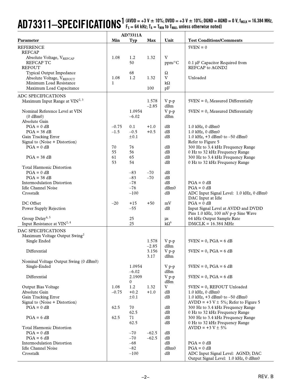 AD73311–SPECIFICATIONS1 (AVDD = +3 V ⴞ 10%; DVDD = +3 V ⴞ 10%; DGND = AGND = 0 V, fMCLK = 16.384 MHz,FS = 64 kHz; TA = TMIN to TMAX, unless otherwise noted)AD73311AParameterMinTypMaxUnitTest Conditions/Comments REFERENCE 5VEN = 0 REFCAP Absolute Voltage, VREFCAP 1.08 1.2 1.32 V REFCAP TC 50 ppm/°C 0.1 µF Capacitor Required from REFOUT REFCAP to AGND2 Typical Output Impedance 68 Ω Absolute Voltage, VREFOUT 1.08 1.2 1.32 V Unloaded Minimum Load Resistance 1 kΩ Maximum Load Capacitance 100 pF ADC SPECIFICATIONS Maximum Input Range at VIN2, 3 1.578 V p-p 5VEN = 0, Measured Differentially –2.85 dBm Nominal Reference Level at VIN 1.0954 V p-p 5VEN = 0, Measured Differentially (0 dBm0) –6.02 dBm Absolute Gain PGA = 0 dB –0.75 0.1 +1.0 dB 1.0 kHz, 0 dBm0 PGA = 38 dB –1.5 –0.5 +0.5 dB 1.0 kHz, 0 dBm0 Gain Tracking Error ±0.1 dB 1.0 kHz, +3 dBm0 to –50 dBm0 Signal to (Noise + Distortion) Refer to Figure 5 PGA = 0 dB 70 76 dB 300 Hz to 3.4 kHz Frequency Range 55 56 dB 0 Hz to 32 kHz Frequency Range PGA = 38 dB 61 65 dB 300 Hz to 3.4 kHz Frequency Range 53 54 dB 0 Hz to 32 kHz Frequency Range Total Harmonic Distortion PGA = 0 dB –83 –70 dB PGA = 38 dB –83 –70 dB Intermodulation Distortion –78 dB PGA = 0 dB Idle Channel Noise –76 dBm0 PGA = 0 dB Crosstalk –100 dB ADC Input Signal Level: 1.0 kHz, 0 dBm0 DAC Input at Idle DC Offset –20 +15 +50 mV PGA = 0 dB Power Supply Rejection –55 dB Input Signal Level at AVDD and DVDD Pins 1.0 kHz, 100 mV p-p Sine Wave Group Delay4, 5 25 µs 64 kHz Output Sample Rate Input Resistance at VIN2, 4 25 kΩ6 DMCLK = 16.384 MHz DAC SPECIFICATIONS Maximum Voltage Output Swing2 Single Ended 1.578 V p-p 5VEN = 0, PGA = 6 dB –2.85 dBm Differential 3.156 V p-p 5VEN = 0, PGA = 6 dB 3.17 dBm Nominal Voltage Output Swing (0 dBm0) Single-Ended 1.0954 V p-p 5VEN = 0, PGA = 6 dB –6.02 dBm Differential 2.1909 V p-p 5VEN = 0, PGA = 6 dB 0 dBm Output Bias Voltage 1.08 1.2 1.32 V 5VEN = 0, REFOUT Unloaded Absolute Gain –0.75 +0.2 +1.0 dB 1.0 kHz, 0 dBm0 Gain Tracking Error ±0.1 dB 1.0 kHz, +3 dBm0 to –50 dBm0 Signal to (Noise + Distortion) AVDD = +3 V ± 5%; Refer to Figure 5 PGA = 0 dB 62.5 70 dB 300 Hz to 3.4 kHz Frequency Range 62.5 dB 0 Hz to 32 kHz Frequency Range PGA = 6 dB 62.5 71 dB 300 Hz to 3.4 kHz Frequency Range 62.5 dB 0 Hz to 32 kHz Frequency Range Total Harmonic Distortion AVDD = +3 V ± 5% PGA = 0 dB –70 –62.5 dB PGA = 6 dB –70 –62.5 dB Intermodulation Distortion –68 dB PGA = 0 dB Idle Channel Noise –82 dBm0 PGA = 0 dB Crosstalk –100 dB ADC Input Signal Level: AGND; DAC Output Signal Level: 1.0 kHz, 0 dBm0 –2– REV. B