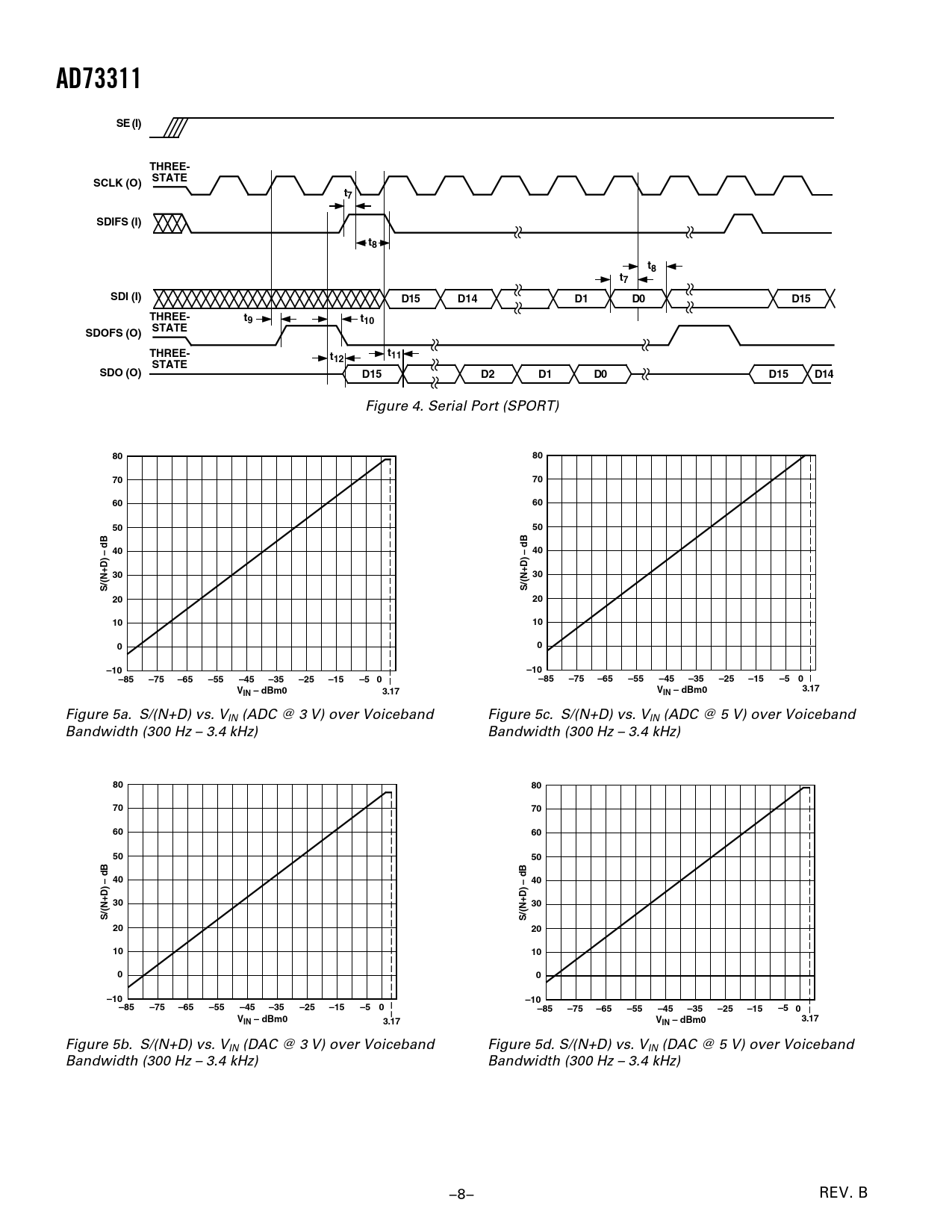 AD73311. SE (I). THREE-. STATE. SCLK (O). SDIFS (I). SDI (I). D15. D14. t10. SDOFS (O). t11. t12. SDO (O). – 40. S/(N+D). –10. –85. –75. –65. –55. –45. –35. –25. –15