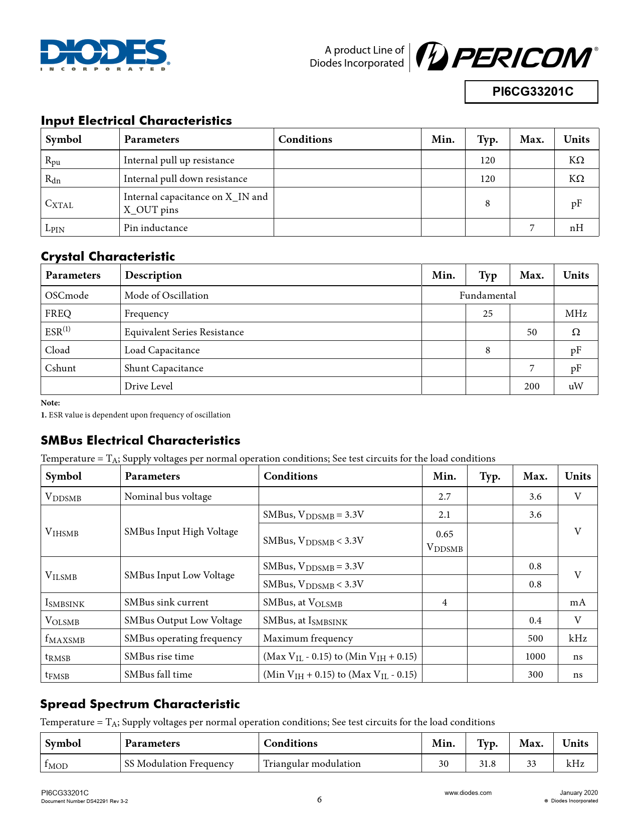 A product Line of Diodes Incorporated PI6CG33201CInput Electrical CharacteristicsSymbolParametersConditionsMin.Typ.Max.Units Rpu Internal pull up resistance 120 KW Rdn Internal pull down resistance 120 KW C Internal capacitance on X_IN and XTAL X_OUT pins 8 pF LPIN Pin inductance 7 nH Crystal CharacteristicParametersDescriptionMin.TypMax.Units OSCmode Mode of Oscillation Fundamental FREQ Frequency 25 MHz ESR(1) Equivalent Series Resistance 50 W Cload Load Capacitance 8 pF Cshunt Shunt Capacitance 7 pF Drive Level 200 uW Note: 1. ESR value is dependent upon frequency of oscillation SMBus Electrical Characteristics Temperature = TA; Supply voltages per normal operation conditions; See test circuits for the load conditions SymbolParametersConditionsMin.Typ.Max.Units VDDSMB Nominal bus voltage 2.7 3.6 V SMBus, VDDSMB = 3.3V 2.1 3.6 VIHSMB SMBus Input High Voltage V SMBus, VDDSMB < 3.3V 0.65 VDDSMB SMBus, V V DDSMB = 3.3V 0.8 ILSMB SMBus Input Low Voltage V SMBus, VDDSMB < 3.3V 0.8 ISMBSINK SMBus sink current SMBus, at VOLSMB 4 mA VOLSMB SMBus Output Low Voltage SMBus, at ISMBSINK 0.4 V fMAXSMB SMBus operating frequency Maximum frequency 500 kHz tRMSB SMBus rise time (Max VIL - 0.15) to (Min VIH + 0.15) 1000 ns tFMSB SMBus fall time (Min VIH + 0.15) to (Max VIL - 0.15) 300 ns Spread Spectrum Characteristic Temperature = TA; Supply voltages per normal operation conditions; See test circuits for the load conditions SymbolParametersConditionsMin.Typ.Max.Units fMOD SS Modulation Frequency Triangular modulation 30 31.8 33 kHz PI6CG33201C www.diodes.com January 2020 Document Number DS42291 Rev 3-2 6 Diodes Incorporated