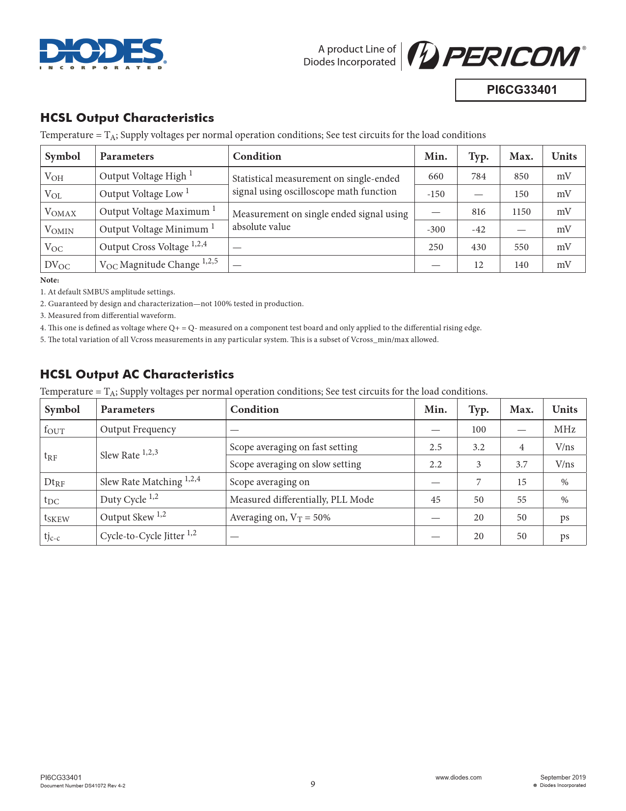 A product Line of Diodes Incorporated PI6CG33401HCSL Output Characteristics Temperature = TA; Supply voltages per normal operation conditions; See test circuits for the load conditions SymbolParametersConditionMin.Typ.Max.Units VOH Output Voltage High 1 Statistical measurement on single-ended 660 784 850 mV V signal using oscilloscope math function OL Output Voltage Low 1 -150 — 150 mV VOMAX Output Voltage Maximum 1 Measurement on single ended signal using — 816 1150 mV V absolute value OMIN Output Voltage Minimum 1 -300 -42 — mV VOC Output Cross Voltage 1,2,4 — 250 430 550 mV DVOC VOC Magnitude Change 1,2,5 — — 12 140 mV Note: 1. At default SMBUS amplitude settings. 2. Guaranteed by design and characterization—not 100% tested in production. 3. Measured from differential waveform. 4. This one is defined as voltage where Q+ = Q- measured on a component test board and only applied to the differential rising edge. 5. The total variation of all Vcross measurements in any particular system. This is a subset of Vcross_min/max allowed. HCSL Output AC Characteristics Temperature = TA; Supply voltages per normal operation conditions; See test circuits for the load conditions. SymbolParametersConditionMin.Typ.Max.Units fOUT Output Frequency — — 100 — MHz tRF Slew Rate 1,2,3 Scope averaging on fast setting 2.5 3.2 4 V/ns Scope averaging on slow setting 2.2 3 3.7 V/ns DtRF Slew Rate Matching 1,2,4 Scope averaging on — 7 15 % tDC Duty Cycle 1,2 Measured differentially, PLL Mode 45 50 55 % tSKEW Output Skew 1,2 Averaging on, VT = 50% — 20 50 ps tjc-c Cycle-to-Cycle Jitter 1,2 — — 20 50 ps PI6CG33401 Document Number DS41072 Rev 4-2 9 www.diodes.com September 2019 Diodes Incorporated