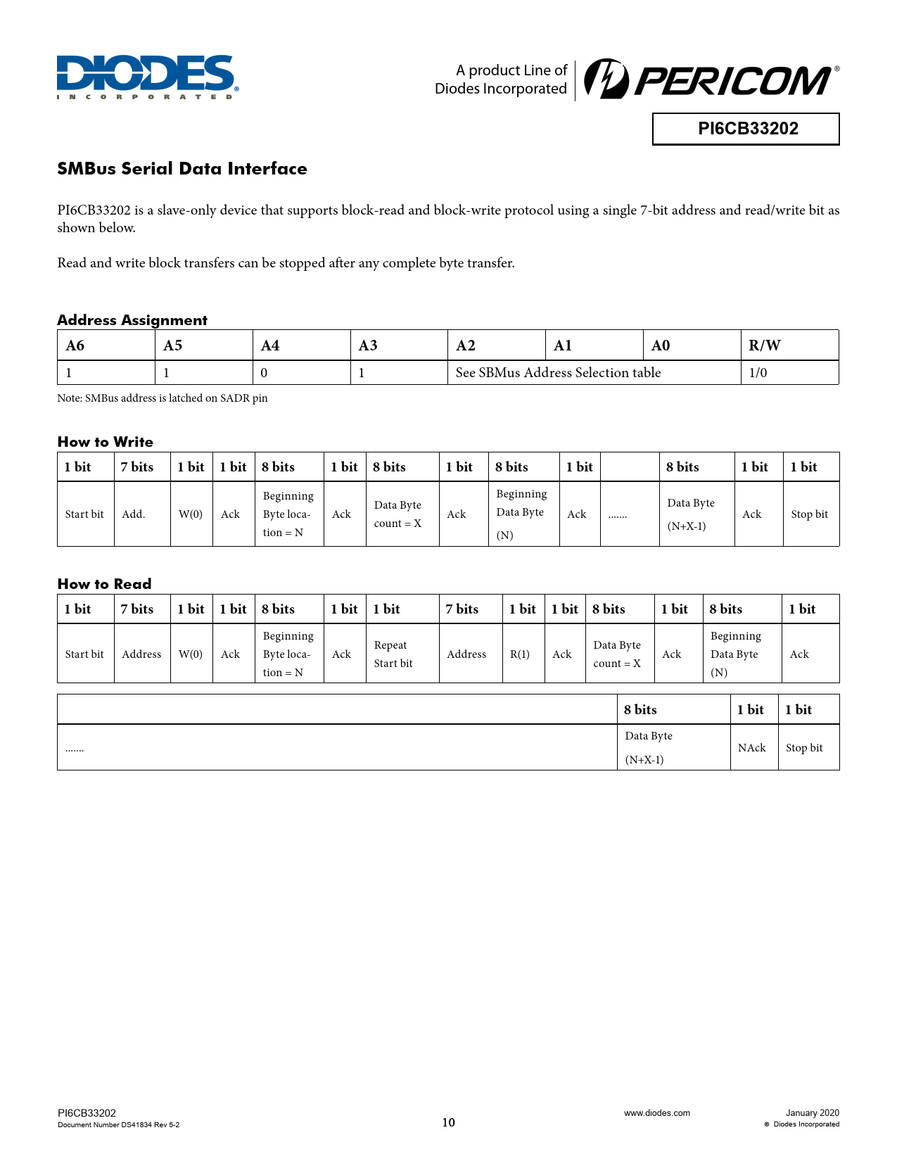 A product Line of Diodes Incorporated PI6CB33202SMBus Serial Data Interface PI6CB33202 is a slave-only device that supports block-read and block-write protocol using a single 7-bit address and read/write bit as shown below. Read and write block transfers can be stopped after any complete byte transfer. Address AssignmentA6A5A4A3A2A1A0R/W 1 1 0 1 See SBMus Address Selection table 1/0 Note: SMBus address is latched on SADR pin How to Write1 bit7 bits1 bit 1 bit 8 bits1 bit 8 bits1 bit8 bits1 bit8 bits1 bit1 bit Beginning Beginning Data Byte Data Byte Start bit Add. W(0) Ack Byte loca- Ack Ack Data Byte Ack ... Ack Stop bit count = X tion = N (N+X-1) (N) How to Read1 bit7 bits1 bit 1 bit 8 bits1 bit 1 bit7 bits1 bit 1 bit 8 bits1 bit8 bits1 bit Beginning Beginning Repeat Data Byte Start bit Address W(0) Ack Byte loca- Ack Address R(1) Ack Ack Data Byte Ack Start bit count = X tion = N (N) 8 bits1 bit1 bit Data Byte ... NAck Stop bit (N+X-1) PI6CB33202 www.diodes.com January 2020 Document Number DS41834 Rev 5-2 10 Diodes Incorporated