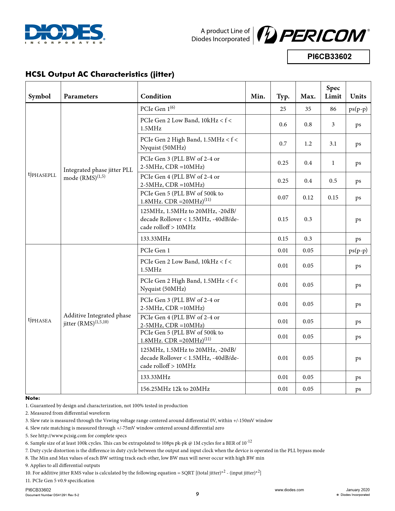 PI6CB33602 HCSL Output AC Characteristics (jitter) Spec Symbol Parameters Condition Min Typ Max Limit Units Note: