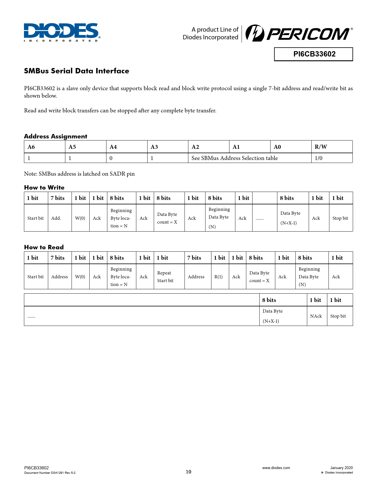 PI6CB33602. SMBus Serial Data Interface. Address Assignment. R/W. How to Write. 1 bit. 7 bits. 1 bit 1 bit 8 bits. 1 bit 8 bits. 8 bits