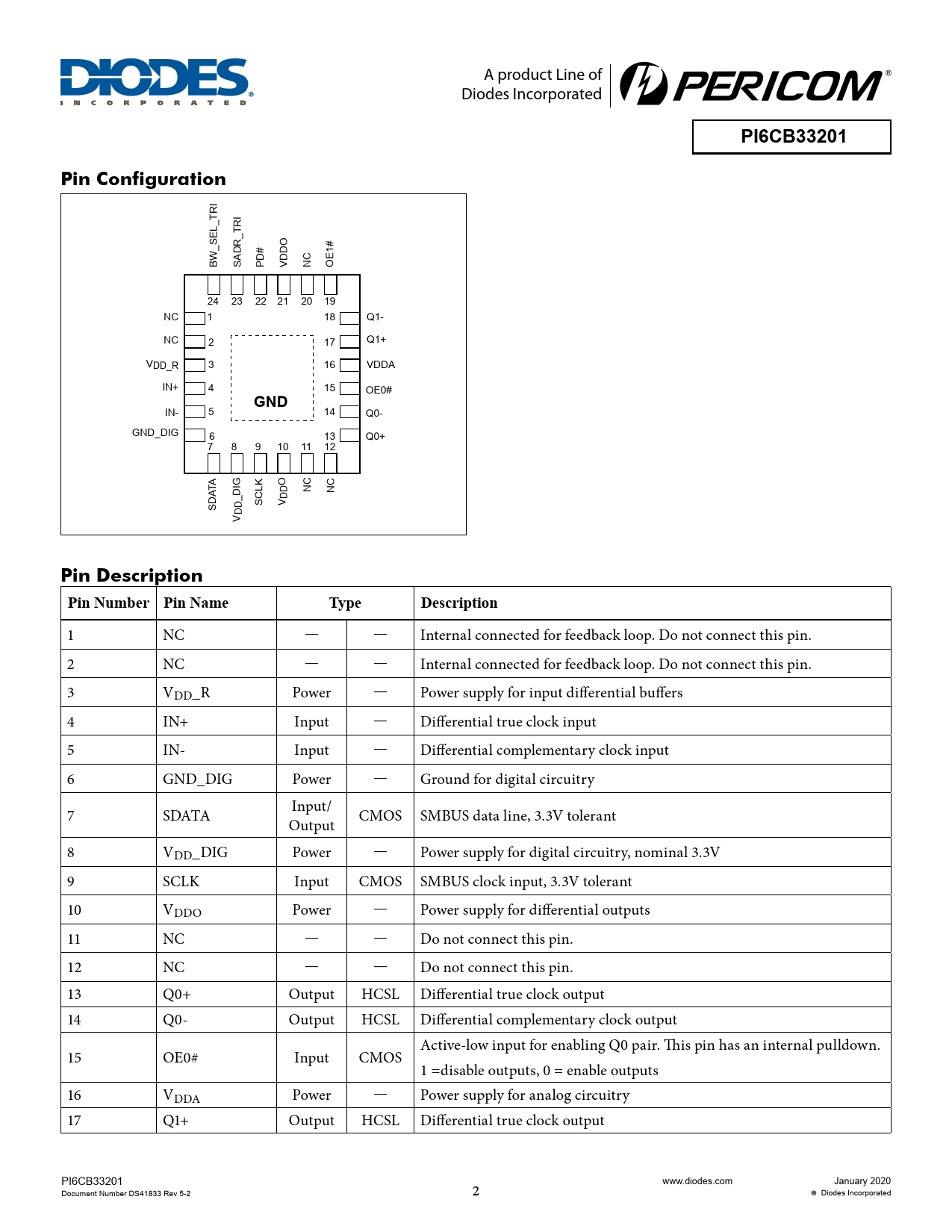 PI6CB33201. Pin Configuration. GND. Pin Description. Pin Number Pin Name. Type. Description