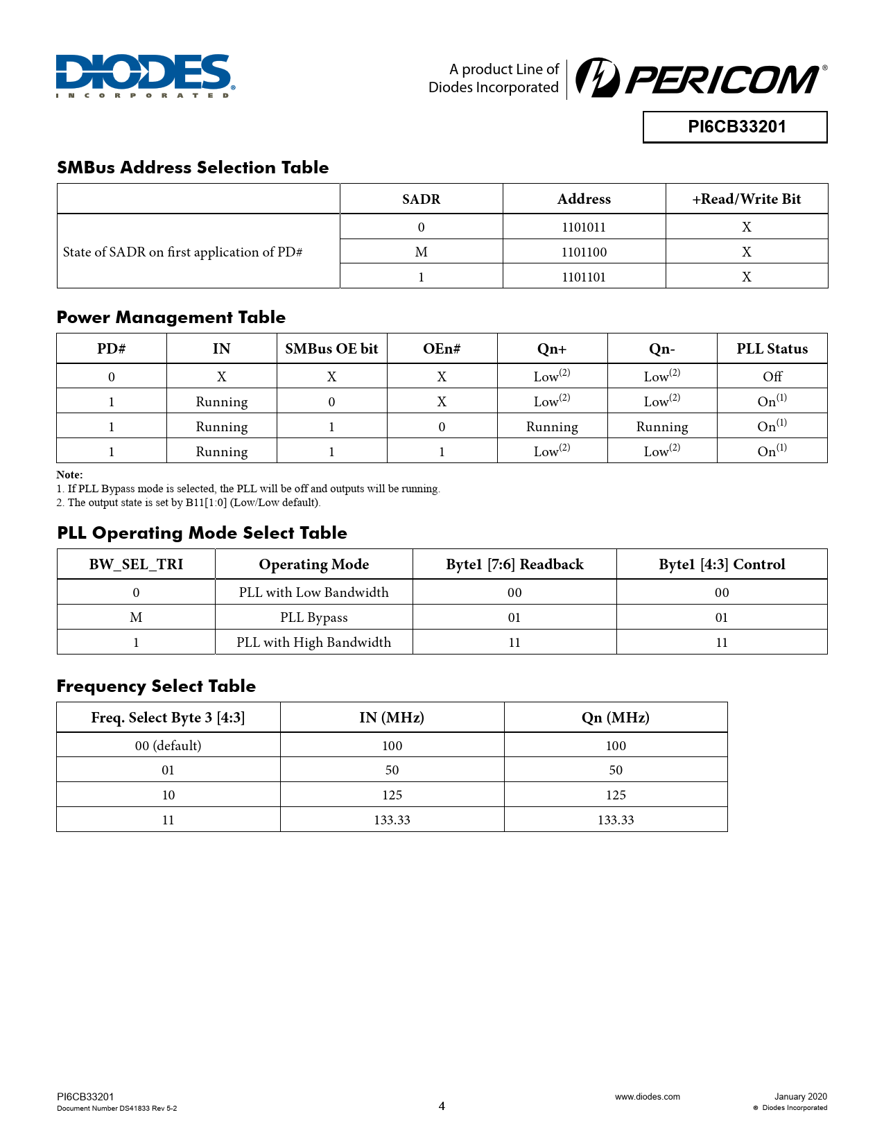 00 (default) 100 100 01 50 50 10 125 125 11 133.33 133.33 PI6CB33201 www.diodes.com January 2020 Document Number DS41833 Rev 5-2 4 Diodes Incorporated