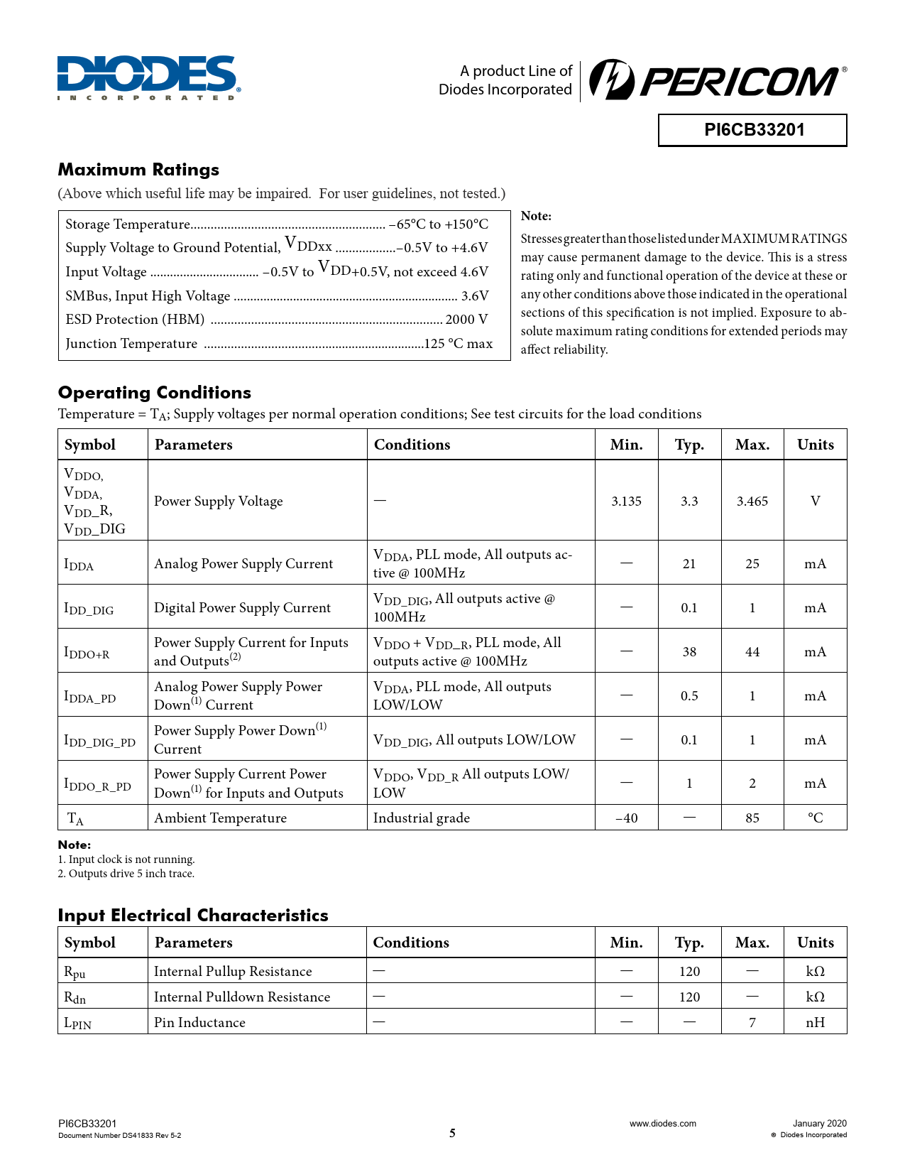 PI6CB33201. Maximum Ratings. Note:. Operating Conditions. Symbol. Parameters. Conditions. Min. Typ. Max. Units