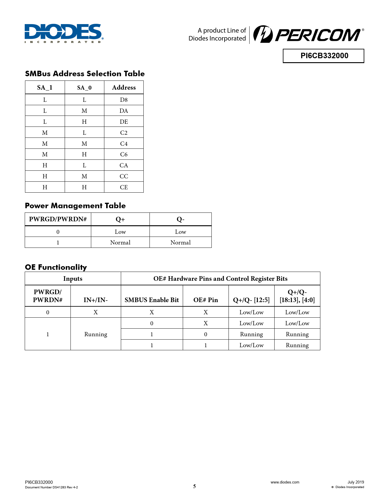 PI6CB332000 SMBus Address Selection Table SA_1 SA_0 Address Power Management Table PWRGD/PWRDN# OE Functionality Inputs