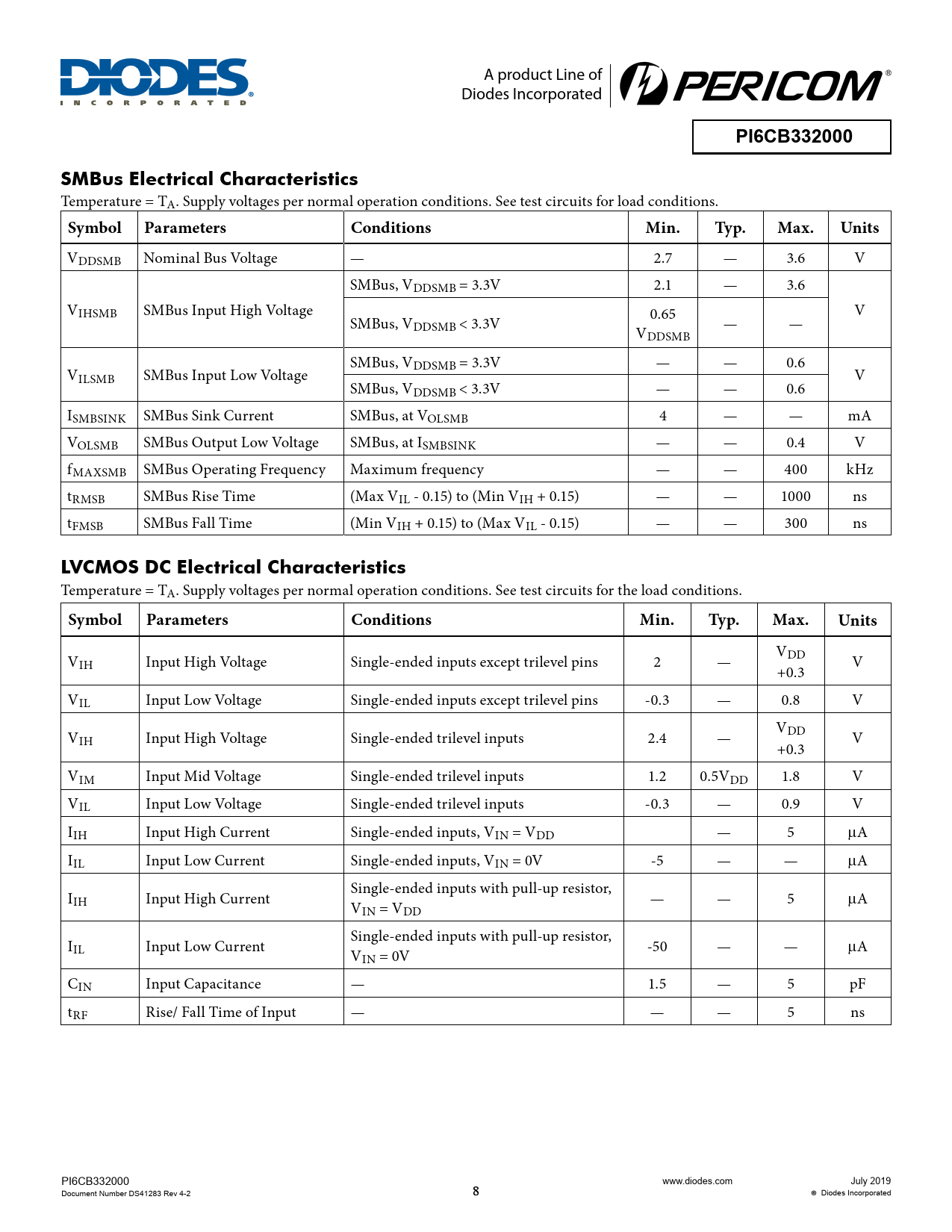PI6CB332000. SMBus Electrical Characteristics. Symbol Parameters. Conditions. Min. Typ. Max. Units