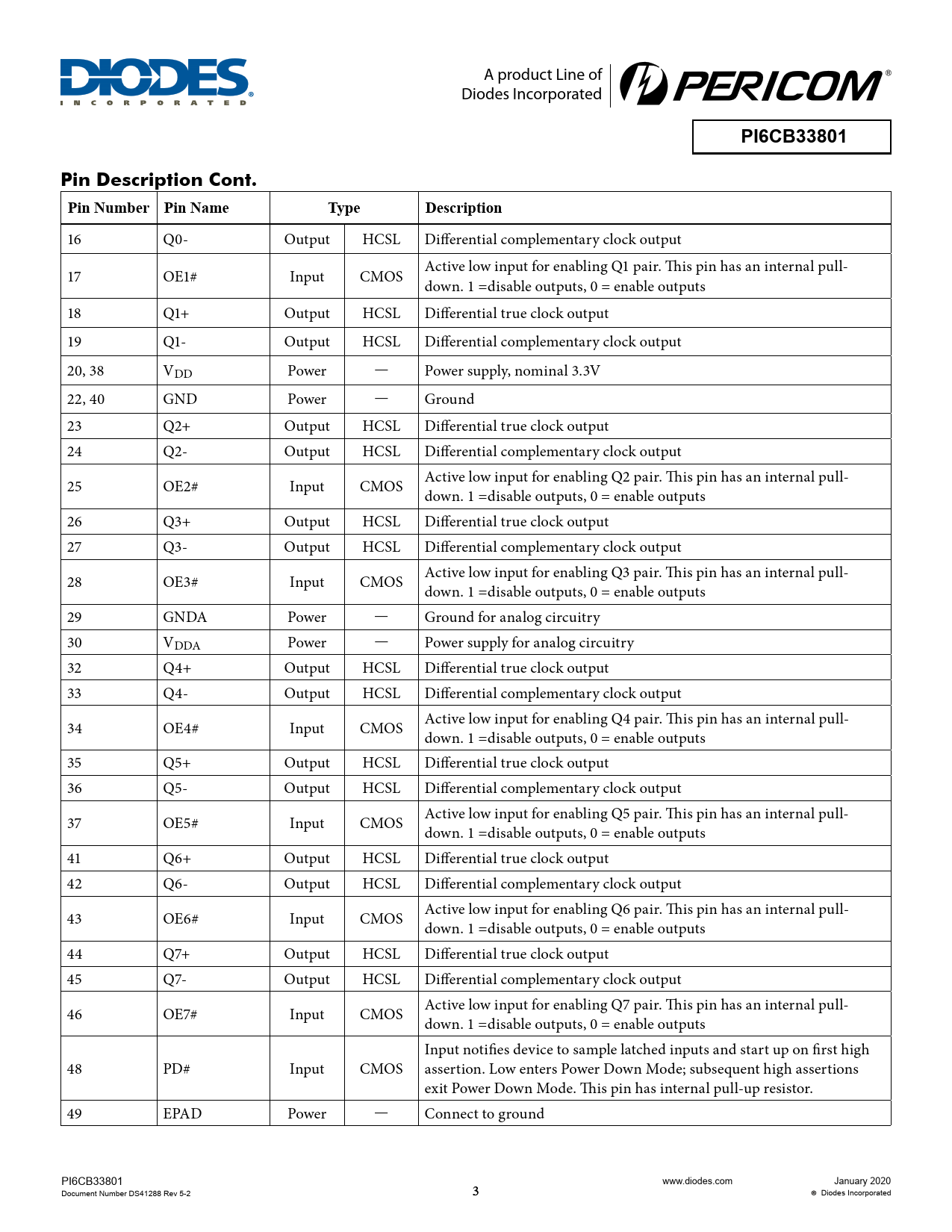 PI6CB33801. Pin Description Cont. Pin Number Pin Name. Type. Description
