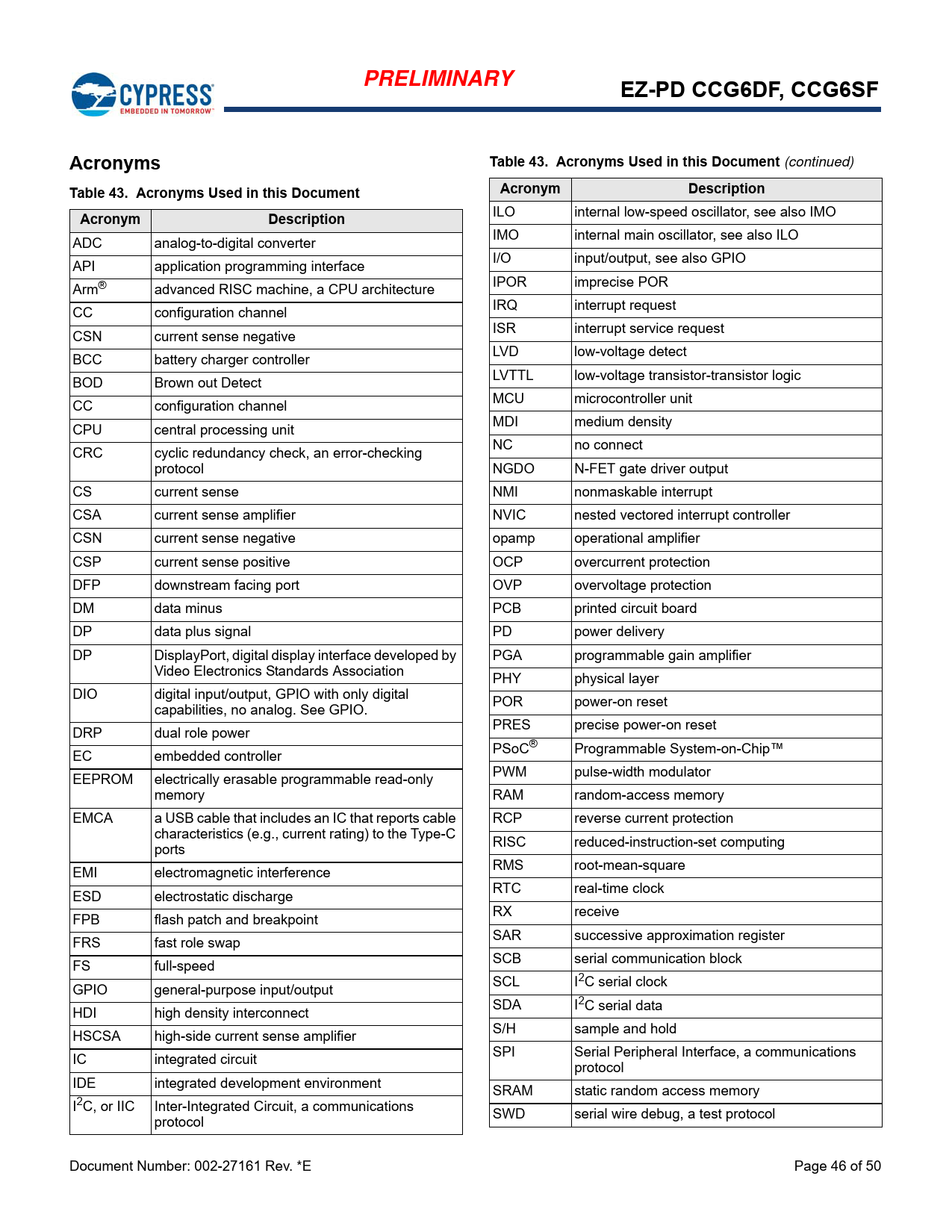 页数 / 页50 / 46 — PRELIMINARY. EZ-PD CCG6DF, CCG6SF. Acronyms. Table 43. Acronyms Used in …
