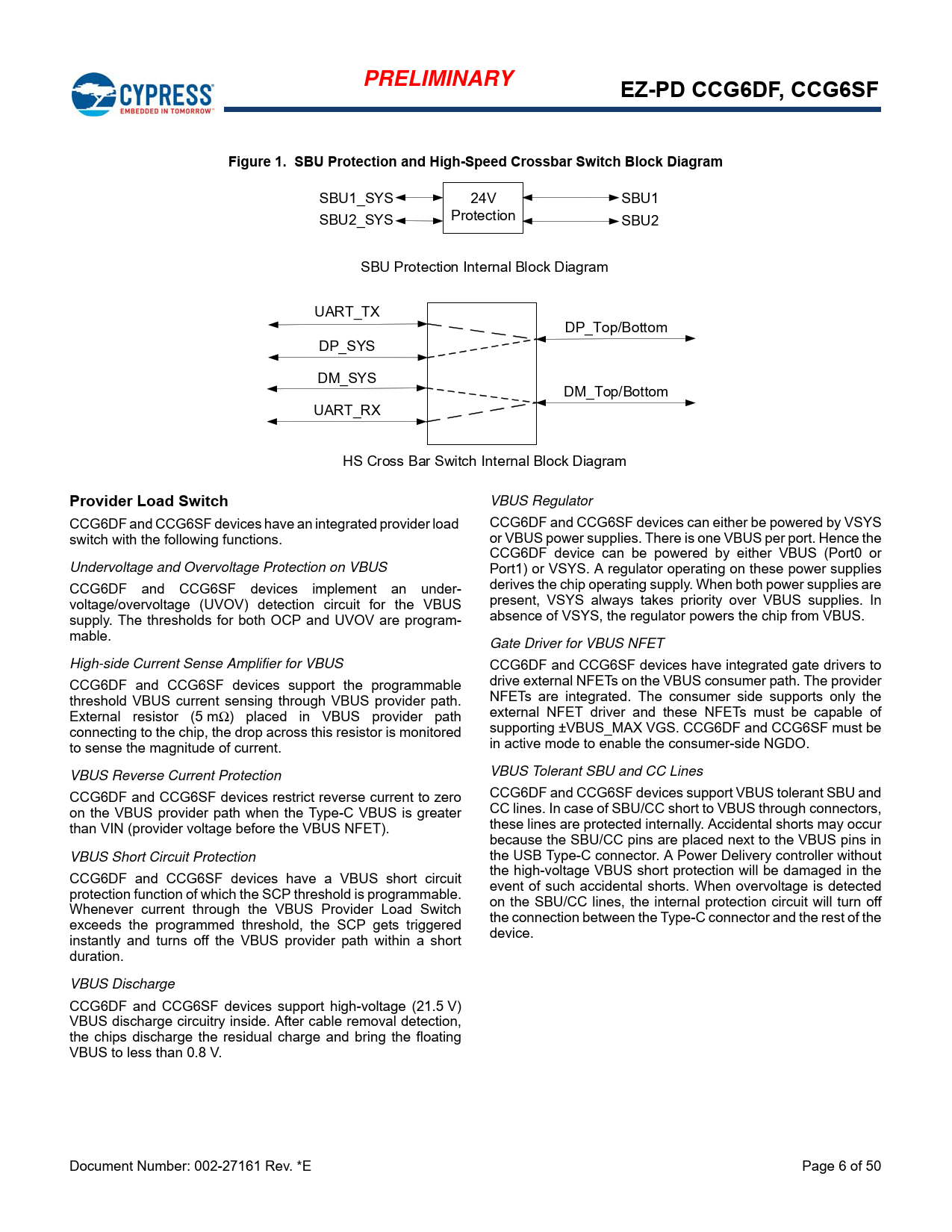 PRELIMINARYEZ-PD CCG6DF, CCG6SFFigure 1. SBU Protection and High-Speed Crossbar Switch Block Diagram SBU1_SYS 24V SBU1 SBU2_SYS Protection SBU2 SBU Protection Internal Block Diagram UART_TX DP_Top/Bottom DP_SYS DM_SYS DM_Top/Bottom UART_RX HS Cross Bar Switch Internal Block Diagram Provider Load Switch VBUS Regulator CCG6DF and CCG6SF devices have an integrated provider load CCG6DF and CCG6SF devices can either be powered by VSYS switch with the following functions. or VBUS power supplies. There is one VBUS per port. Hence the CCG6DF device can be powered by either VBUS (Port0 or Undervoltage and Overvoltage Protection on VBUS Port1) or VSYS. A regulator operating on these power supplies CCG6DF and CCG6SF devices implement an under- derives the chip operating supply. When both power supplies are voltage/overvoltage (UVOV) detection circuit for the VBUS present, VSYS always takes priority over VBUS supplies. In supply. The thresholds for both OCP and UVOV are program- absence of VSYS, the regulator powers the chip from VBUS. mable. Gate Driver for VBUS NFET High-side Current Sense Amplifier for VBUS CCG6DF and CCG6SF devices have integrated gate drivers to CCG6DF and CCG6SF devices support the programmable drive external NFETs on the VBUS consumer path. The provider threshold VBUS current sensing through VBUS provider path. NFETs are integrated. The consumer side supports only the External resistor (5 mΩ) placed in VBUS provider path external NFET driver and these NFETs must be capable of connecting to the chip, the drop across this resistor is monitored supporting ±VBUS_MAX VGS. CCG6DF and CCG6SF must be to sense the magnitude of current. in active mode to enable the consumer-side NGDO. VBUS Reverse Current Protection VBUS Tolerant SBU and CC Lines CCG6DF and CCG6SF devices restrict reverse current to zero CCG6DF and CCG6SF devices support VBUS tolerant SBU and on the VBUS provider path when the Type-C VBUS is greater CC lines. In case of SBU/CC short to VBUS through connectors, than VIN (provider voltage before the VBUS NFET). these lines are protected internally. Accidental shorts may occur because the SBU/CC pins are placed next to the VBUS pins in VBUS Short Circuit Protection the USB Type-C connector. A Power Delivery controller without the high-voltage VBUS short protection will be damaged in the CCG6DF and CCG6SF devices have a VBUS short circuit protection function of which the SCP threshold is programmable. event of such accidental shorts. When overvoltage is detected Whenever current through the VBUS Provider Load Switch on the SBU/CC lines, the internal protection circuit will turn off the connection between the Type-C connector and the rest of the exceeds the programmed threshold, the SCP gets triggered instantly and turns off the VBUS provider path within a short device. duration. VBUS Discharge CCG6DF and CCG6SF devices support high-voltage (21.5 V) VBUS discharge circuitry inside. After cable removal detection, the chips discharge the residual charge and bring the floating VBUS to less than 0.8 V. Document Number: 002-27161 Rev. *E Page 6 of 50 Document Outline EZ-PD CCG6DF, CCG6SF, USB Type-C Port Controller General Description Applications Features USB-PD Type-C Mux Integrated Provider VBUS Load Switch LDO 32-bit MCU Subsystem Integrated Digital Blocks Authentication Clocks and Oscillators Operating Range Hot-Swappable I/Os Packages Logic Block Diagram CCG6DF/CCG6SF Functional Diagram Contents Functional Overview MCU Subsystem CPU Flash, SROM, and RAM USB-PD Subsystem (SS) USB-PD Physical Layer VCONN FET ADC SBU Pass-Through Switch and USB HS Mux Provider Load Switch Undervoltage and Overvoltage Protection on VBUS High-side Current Sense Amplifier for VBUS VBUS Reverse Current Protection VBUS Short Circuit Protection VBUS Discharge VBUS Regulator Gate Driver for VBUS NFET VBUS Tolerant SBU and CC Lines Serial Communication Block (SCB) Timer, Counter, Pulse-Width Modulator (TCPWM) True Random Number Generator (TRNG) GPIO Interface System Resources Watchdog Timer (WDT) Clock System IMO Clock Source ILO Clock Source Power Pinouts Application Diagrams CCG6DF, CCG6SF Layout Design Guidelines for BGA Package Usage of Via Size of 8-mil drill/16-mil diameter and 10-mil drill/16-mil diameter Layer Stack-up Top Layer Fan Out Via Count for GND Pads Via Count for Provider Pads High-Speed (DP_SYS, DM_SYS) USB Connections CC Connections CC lines for CCG6DF/CCG6SF devices carry ~500-mA current. In the top layer, two CC pads are shorted using 0.2mm trace width and connected to other layers through one via. The capacitors are placed on bottom layer and are routed to the Type-C Connecto... Rsense and Capacitor Connections for Provider VBUS The differential signal from Rsense should be length matched. The capacitor for Provider VBUS should be as close as possible to the Rsense and connected using copper shape. Figure 19 and Figure 20 show routing for Rsense. Trace Width Details for Critical Signals VDDIO, VCCD, VSYS, and VDDD Connections Figure 21 and Figure 22 show how the VDDIO, VDDD, VSYS, and VCCD signals get routed amongst the top and bottom layers. Capacitor Connections for CC Lines and Bypass Capacitors for VDDIO, VDDD, VCCD, and VSYS Pins Figure 23 shows how the relevant capacitors can be placed for via sizes of 8-mil drill, 16-mil diameter or 10-mil drill, 16-mil diameter. Electrical Specifications Absolute Maximum Ratings Device-Level Specifications DC Specifications CPU GPIO XRES Digital Peripherals Pulse Width Modulation (PWM) for GPIO Pins I2C UART SPI Memory System Resources Power-on-Reset (POR) with Brown Out SWD Interface Internal Main Oscillator Internal Low-speed Oscillator PD Analog-to-Digital Converter VSYS Switch CSA VBUS UV/OV Provider Side RCP SBU Switch DP/DM Switch VCONN Switch VBUS Ordering Information Ordering Code Definitions Packaging Acronyms Document Conventions Units of Measure References and Links to Applications Collateral Knowledge Base Articles Applica