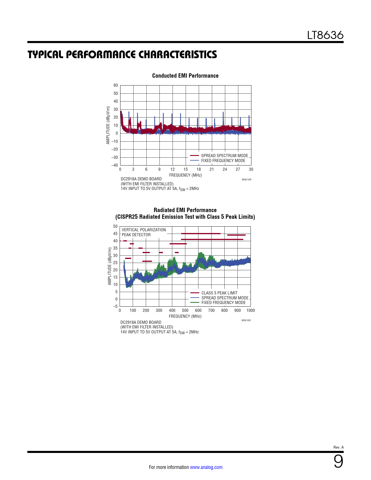 60 50 40 30 V/m) 20 10 0 –10 AMPLITUDE (dBµ –20 SPREAD SPECTRUM MODE –30 FIXED FREQUENCY MODE –40 0 3 6 9 12 15 18 21 24 27 30 FREQUENCY (MHz) DC2918A DEMO BOARD 8636 G49 (WITH EMI FILTER INSTALLED) 14V INPUT TO 5V OUTPUT AT 5A, fSW = 2MHz