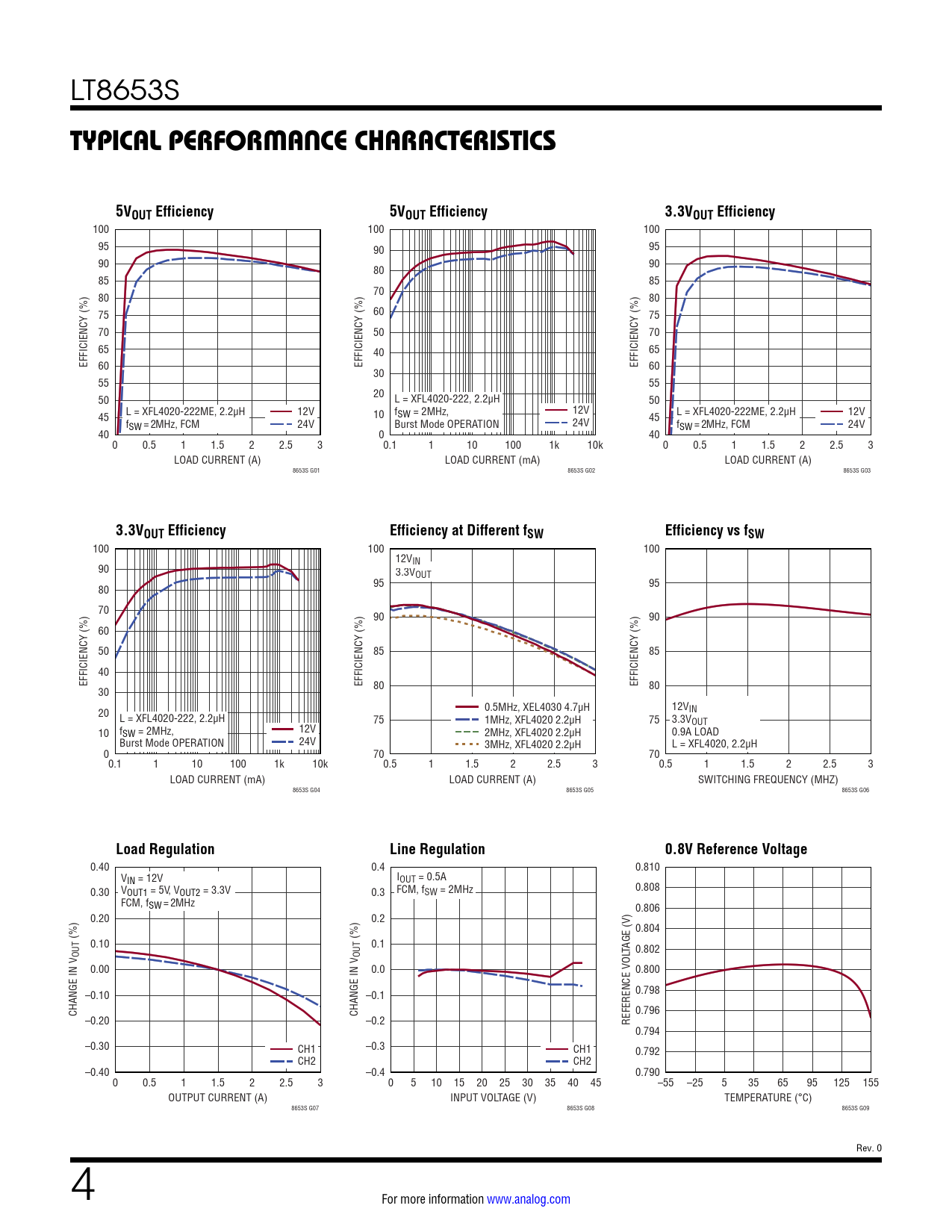 0.40 0.4 0.810 VIN = 12V IOUT = 0.5A 0.30 VOUT1 = 5V, VOUT2 = 3.3V FCM, f 0.3 SW = 2MHz 0.808 FCM, fSW = 2MHz 0.806 0.20 0.2 0.804 (%) 0.10 (%) 0.1 OUT OUT TAGE (V) 0.802 0.00 0.0 0.800 –0.10 –0.1 0.798 CHANGE IN V CHANGE IN V 0.796 –0.20 –0.2 REFERENCE VOL 0.794 –0.30 CH1 –0.3 CH1 0.792 CH2 CH2 –0.40 –0.4 0.790 0 0.5 1 1.5 2 2.5 3 0 5 10 15 20 25 30 35 40 45 –55 –25 5 35 65 95 125 155 OUTPUT CURRENT (A) INPUT VOLTAGE (V) TEMPERATURE (°C) 8653S G07 8653S G08 8653S G09 Rev. 0 4 For more information www.analog.com Document Outline Features Applications Typical Application Description Absolute Maximum Ratings Order Information Electrical Characteristics Pin Configuration Typical Performance Characteristics Pin Functions Block Diagram Operation Applications Information Typical Applications Package Description Typical Application Related Parts