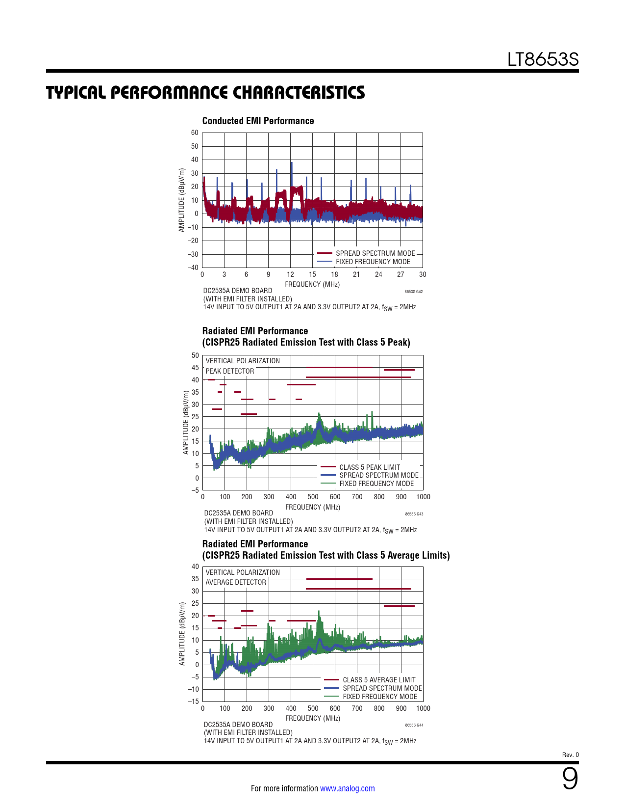 60 50 40 30 V/m) 20 10 0 –10 AMPLITUDE (dBµ –20 –30 SPREAD SPECTRUM MODE FIXED FREQUENCY MODE –40 0 3 6 9 12 15 18 21 24 27 30 FREQUENCY (MHz) DC2535A DEMO BOARD 8653S G42 (WITH EMI FILTER INSTALLED) 14V INPUT TO 5V OUTPUT1 AT 2A AND 3.3V OUTPUT2 AT 2A, fSW = 2MHz