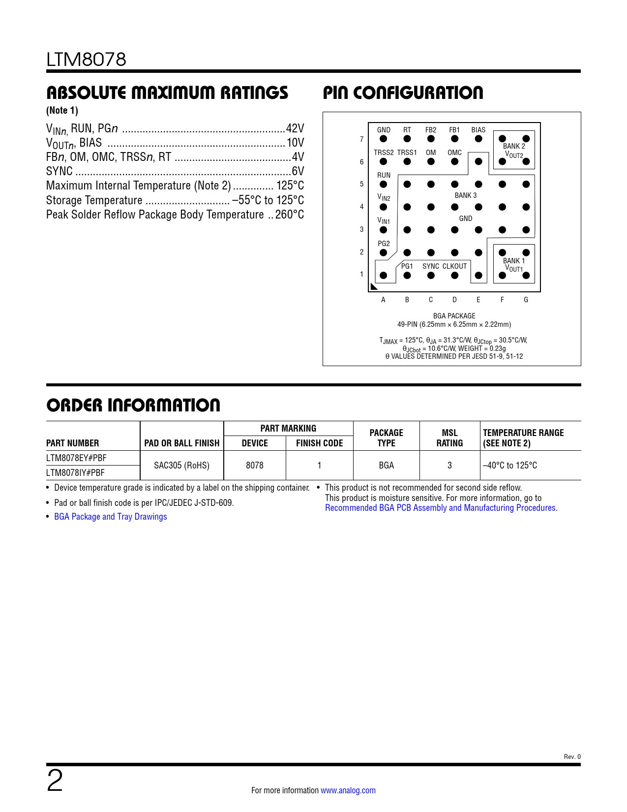 LTM8078EY#PBF SAC305 (RoHS) 8078 1 BGA 3 –40°C to 125°C LTM8078IY#PBF • Device temperature grade is indicated by a label on the shipping container. • This product is not recommended for second side reflow. • Pad or ball finish code is per IPC/JEDEC J-STD-609. This product is moisture sensitive. For more information, go to Recommended BGA PCB Assembly and Manufacturing Procedures. • BGA Package and Tray Drawings Rev. 0 2 For more information www.analog.com Document Outline Features Applications Typical Application Description Absolute Maximum Ratings Order Information Pin Configuration Electrical Characteristics Typical Performance Characteristics Pin Functions Block Diagram Operation Applications Information Typical Application Package Description Package Photograph Related Parts