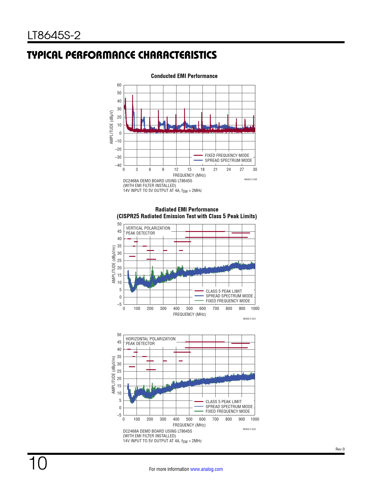 60 50 40 30 V) Bµ 20 10 0 –10 AMPLITUDE (d –20 FIXED FREQUENCY MODE –30 SPREAD SPECTRUM MODE –40 0 3 6 9 12 15 18 21 24 27 30 FREQUENCY (MHz) DC2468A DEMO BOARD USING LT8645S 8645S-2 G40 (WITH EMI FILTER INSTALLED) 14V INPUT TO 5V OUTPUT AT 4A, fSW = 2MHz