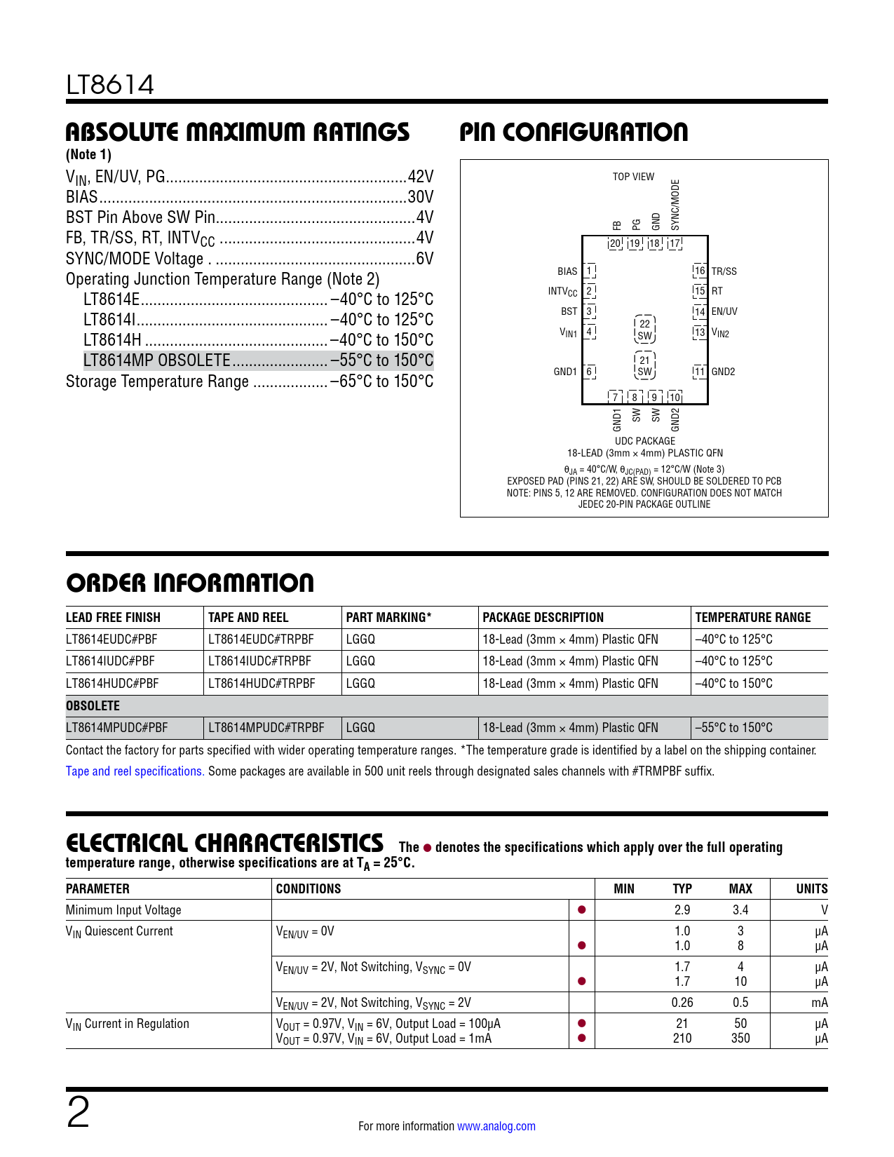 LT8614EUDC#PBF LT8614EUDC#TRPBF LGGQ 18-Lead (3mm × 4mm) Plastic QFN –40°C to 125°C LT8614IUDC#PBF LT8614IUDC#TRPBF LGGQ 18-Lead (3mm × 4mm) Plastic QFN –40°C to 125°C LT8614HUDC#PBF LT8614HUDC#TRPBF LGGQ 18-Lead (3mm × 4mm) Plastic QFN –40°C to 150°C