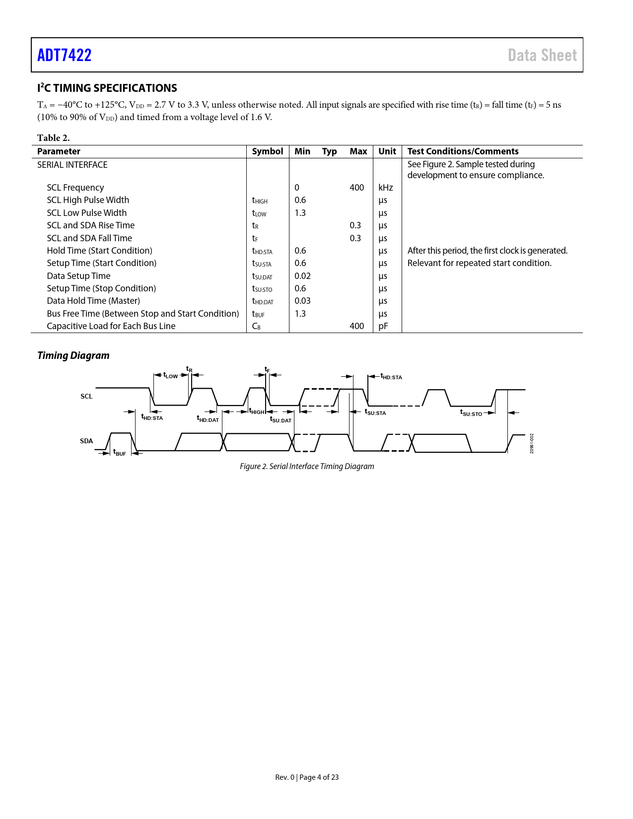 页数 / 页23 / 4 — ADT7422. Data Sheet. I2C TIMING SPECIFICATIONS. Table 2. Parameter …