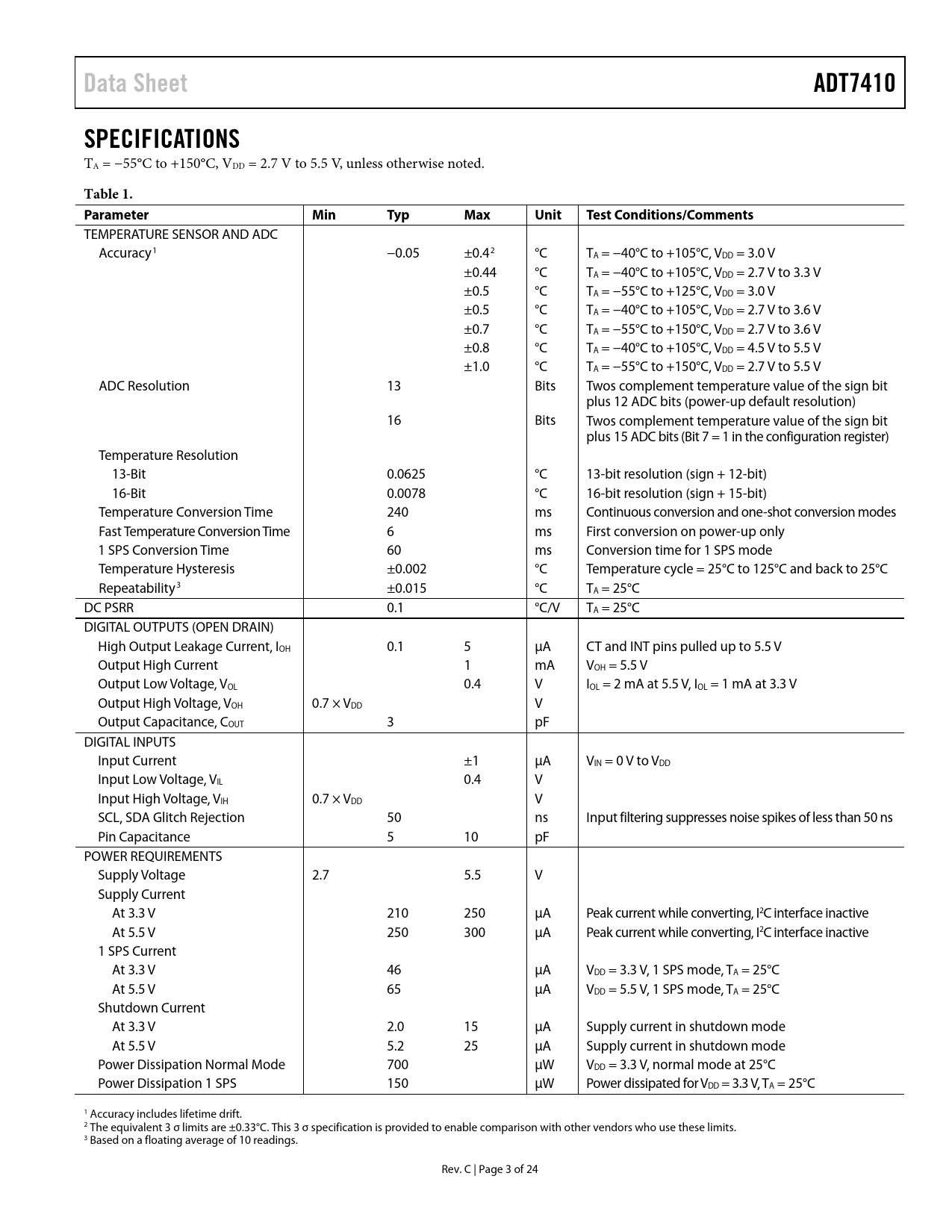 Data Sheet. ADT7410. SPECIFICATIONS. Table 1. Parameter. Min. Typ. Max. Unit. Test Conditions/Comments