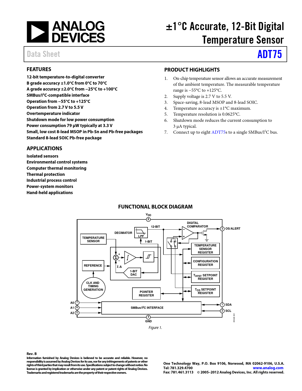 ±1°C Accurate, 12-Bit Digital. Temperature Sensor. Data Sheet. ADT75. FEATURES. PRODUCT HIGHLIGHTS