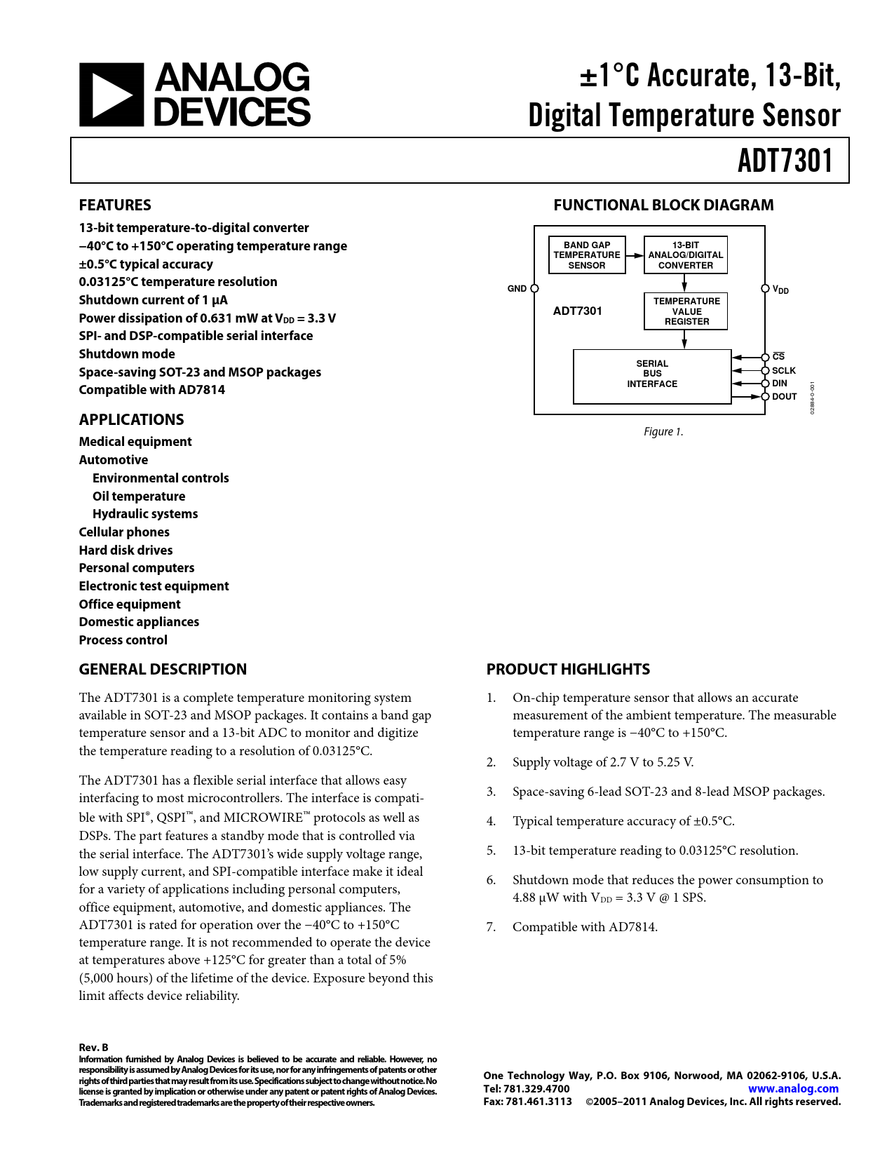 ±1°C Accurate, 13-Bit,. Digital Temperature Sensor. ADT7301. FEATURES. FUNCTIONAL BLOCK DIAGRAM