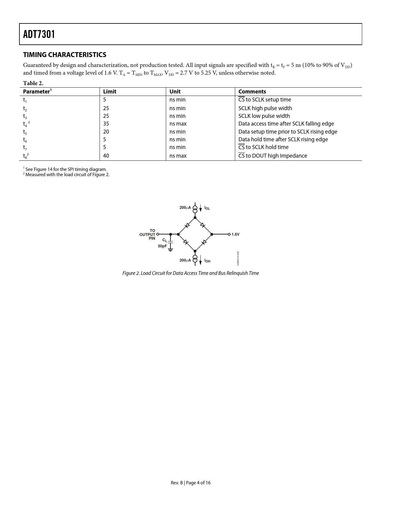 ADT7301. TIMING CHARACTERISTICS. Table 2. Parameter1. Limit. Unit. Comments. 200. IOL. OUTPUT. 1.6V. PIN. 50pF. IOH