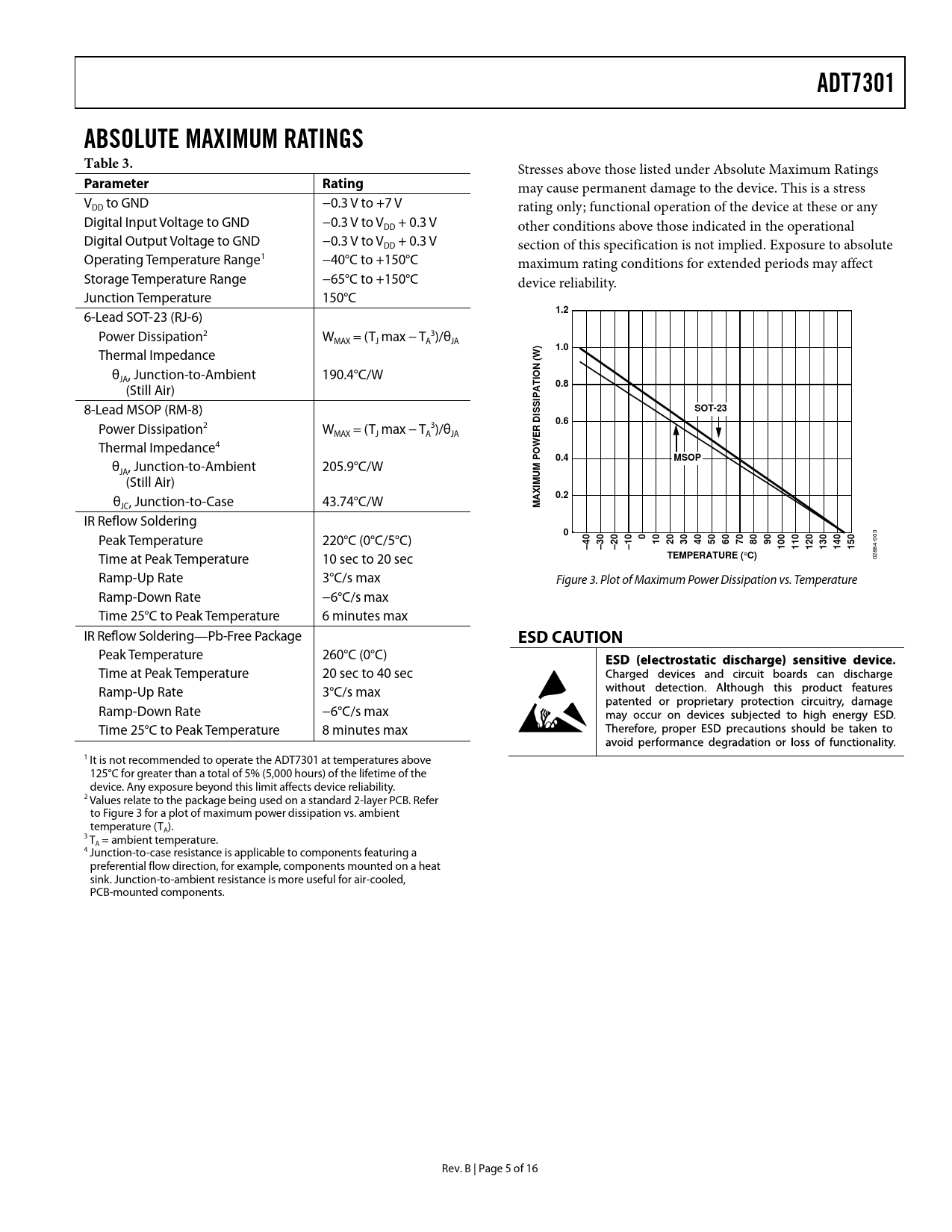ADT7301. ABSOLUTE MAXIMUM RATINGS Table 3. Parameter. Rating. 1.2. 1.0. 0.8. SOT-23. 0.6. 0.4. MSOP. 0.2. MAXIMUM POWER DISSIPATION (W). –40. –30