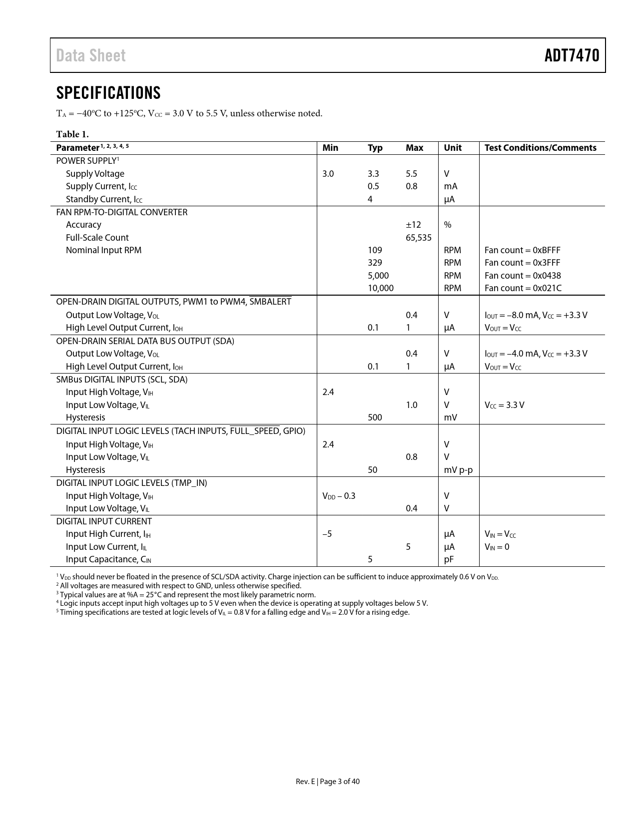 link to page 3 link to page 3 Data SheetADT7470SPECIFICATIONS TA = −40oC to +125oC, VCC = 3.0 V to 5.5 V, unless otherwise noted. Table 1. Parameter1, 2, 3, 4, 5MinTypMaxUnitTest Conditions/Comments POWER SUPPLY1 Supply Voltage 3.0 3.3 5.5 V Supply Current, ICC 0.5 0.8 mA Standby Current, ICC 4 µA FAN RPM-TO-DIGITAL CONVERTER Accuracy ±12 % Full-Scale Count 65,535 Nominal Input RPM 109 RPM Fan count = 0xBFFF 329 RPM Fan count = 0x3FFF 5,000 RPM Fan count = 0x0438 10,000 RPM Fan count = 0x021C OPEN-DRAIN DIGITAL OUTPUTS, PWM1 to PWM4, SMBALERT Output Low Voltage, VOL 0.4 V IOUT = –8.0 mA, VCC = +3.3 V High Level Output Current, IOH 0.1 1 µA VOUT = VCC OPEN-DRAIN SERIAL DATA BUS OUTPUT (SDA) Output Low Voltage, VOL 0.4 V IOUT = –4.0 mA, VCC = +3.3 V High Level Output Current, IOH 0.1 1 µA VOUT = VCC SMBus DIGITAL INPUTS (SCL, SDA) Input High Voltage, VIH 2.4 V Input Low Voltage, VIL 1.0 V VCC = 3.3 V Hysteresis 500 mV DIGITAL INPUT LOGIC LEVELS (TACH INPUTS, FULL_SPEED, GPIO) Input High Voltage, VIH 2.4 V Input Low Voltage, VIL 0.8 V Hysteresis 50 mV p-p DIGITAL INPUT LOGIC LEVELS (TMP_IN) Input High Voltage, VIH VDD – 0.3 V Input Low Voltage, VIL 0.4 V DIGITAL INPUT CURRENT Input High Current, IIH –5 µA VIN = VCC Input Low Current, IIL 5 µA VIN = 0 Input Capacitance, CIN 5 pF 1 VDD should never be floated in the presence of SCL/SDA activity. Charge injection can be sufficient to induce approximately 0.6 V on VDD. 2 All voltages are measured with respect to GND, unless otherwise specified. 3 Typical values are at %A = 25°C and represent the most likely parametric norm. 4 Logic inputs accept input high voltages up to 5 V even when the device is operating at supply voltages below 5 V. 5 Timing specifications are tested at logic levels of VIL = 0.8 V for a falling edge and VIH = 2.0 V for a rising edge. Rev. E | Page 3 of 40 Document Outline Features Applications General Description Functional Block Diagram Revision History Specifications Serial Bus Timing Specifications Absolute Maximum Ratings Thermal Characteristics ESD Caution Pin Configuration and Function Descriptions Functional Description General Description ADT7470 Monitoring Cycle Configuration Register 1 (Address 0x40) Configuration Register 2 (Address 0x74) ID Registers General-Purpose I/O Pins (Open Drain) SMBus/I2C Serial Interface Address Selection Serial Bus Protocol Write Operations Send Byte Write Byte Read Operations Receive Byte Alert Response Address SMBus Timeout Temperature Measurement Using TMP05/TMP06 Measuring Temperature TMP05/TMP06 Decoder Temperature ReadBack By the Host Temperature Data Format Temperature Measurement Limits Thermal Zones for Automatic Fan Control Thermal Zone TMIN Limit and Status Registers Limit Values Temperature Limits Fan Speed Limits Out-of-Limit Comparisons Status Registers SMBALERT Interrupt Handling SMBALERT Interrupts Masking Interrupt Sources Enabling the SMBALERT Interrupt Output Fan Drive Using PWM Control High Frequency Fan Drive Low Frequency Fan Drive Setting the Fan Drive Frequency Inverted PWM Output Fan Full Speed Function Fan Speed Measurement Tach Inputs Pulse Stretching Disabling Tach measurement Fan Speed Measurement Fan Speed Measurement Registers Reading Fan Speed from the ADT7470 Fan Tach Limit Registers Fan Speed Measurement Rate Calculating Fan Speed and Tachometer Limits Fan Pulses per Revolution Manual Fan Speed Control Setting the PWM Duty Cycle Example 1: For a PWM Duty Cycle of 50% Example 2: For a PWM Duty Cycle of 33% Automatic Fan Speed Control PWM Min Duty Cycle Example: For a PWM Min Duty Cycle of 30% PWN Max Duty Cycle PWM Current Duty Cycle Register Map Detailed Register Descriptions Outline Dimensions Ordering Guide