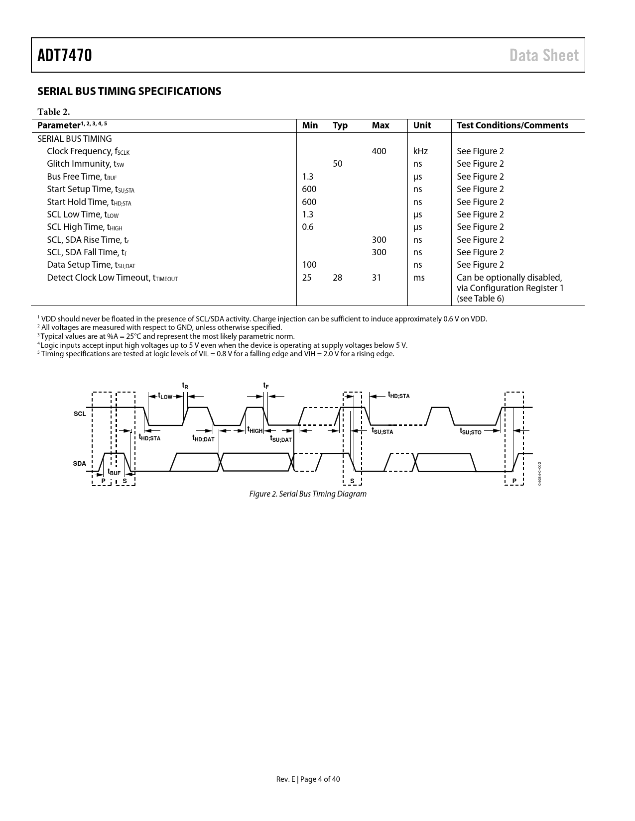 link to page 4 link to page 4 link to page 4 link to page 4 link to page 4 link to page 4 link to page 4 link to page 4 link to page 4 link to page 4 link to page 12 link to page 4 ADT7470Data SheetSERIAL BUS TIMING SPECIFICATIONSTable 2. Parameter1, 2, 3, 4, 5 MinTypMaxUnitTestConditions/Comments SERIAL BUS TIMING Clock Frequency, fSCLK 400 kHz See Figure 2 Glitch Immunity, tSW 50 ns See Figure 2 Bus Free Time, tBUF 1.3 μs See Figure 2 Start Setup Time, tSU;STA 600 ns See Figure 2 Start Hold Time, tHD;STA 600 ns See Figure 2 SCL Low Time, tLOW 1.3 μs See Figure 2 SCL High Time, tHIGH 0.6 μs See Figure 2 SCL, SDA Rise Time, tr 300 ns See Figure 2 SCL, SDA Fall Time, tf 300 ns See Figure 2 Data Setup Time, tSU;DAT 100 ns See Figure 2 Detect Clock Low Timeout, tTIMEOUT 25 28 31 ms Can be optionally disabled, via Configuration Register 1 (see Table 6) 1 VDD should never be floated in the presence of SCL/SDA activity. Charge injection can be sufficient to induce approximately 0.6 V on VDD. 2 All voltages are measured with respect to GND, unless otherwise specified. 3 Typical values are at %A = 25°C and represent the most likely parametric norm. 4 Logic inputs accept input high voltages up to 5 V even when the device is operating at supply voltages below 5 V. 5 Timing specifications are tested at logic levels of VIL = 0.8 V for a falling edge and VIH = 2.0 V for a rising edge. tRtFttLOWHD;STASCLtHIGHtSU;STAtSU;STOtHD;STAtHD;DATtSU;DATSDAtBUFPSSP 04684-0-002 Figure 2. Serial Bus Timing Diagram Rev. E | Page 4 of 40 Document Outline Features Applications General Description Functional Block Diagram Revision History Specifications Serial Bus Timing Specifications Absolute Maximum Ratings Thermal Characteristics ESD Caution Pin Configuration and Function Descriptions Functional Description General Description ADT7470 Monitoring Cycle Configuration Register 1 (Address 0x40) Configuration Register 2 (Address 0x74) ID Registers General-Purpose I/O Pins (Open Drain) SMBus/I2C Serial Interface Address Selection Serial Bus Protocol Write Operations Send Byte Write Byte Read Operations Receive Byte Alert Response Address SMBus Timeout Temperature Measurement Using TMP05/TMP06 Measuring Temperature TMP05/TMP06 Decoder Temperature ReadBack By the Host Temperature Data Format Temperature Measurement Limits Thermal Zones for Automatic Fan Control Thermal Zone TMIN Limit and Status Registers Limit Values Temperature Limits Fan Speed Limits Out-of-Limit Comparisons Status Registers SMBALERT Interrupt Handling SMBALERT Interrupts Masking Interrupt Sources Enabling the SMBALERT Interrupt Output Fan Drive Using PWM Control High Frequency Fan Drive Low Frequency Fan Drive Setting the Fan Drive Frequency Inverted PWM Output Fan Full Speed Function Fan Speed Measurement Tach Inputs Pulse Stretching Disabling Tach measurement Fan Speed Measurement Fan Speed Measurement Registers Reading Fan Speed from the ADT7470 Fan Tach Limit Registers Fan Speed Measurement Rate Calculating Fan Speed and Tachometer Limits Fan Pulses per Revolution Manual Fan Speed Control Setting the PWM Duty Cycle Example 1: For a PWM Duty Cycle of 50% Example 2: For a PWM Duty Cycle of 33% Automatic Fan Speed Control PWM Min Duty Cycle Example: For a PWM Min Duty Cycle of 30% PWN Max Duty Cycle PWM Current Duty Cycle Register Map Detailed Register Descriptions Outline Dimensions Ordering Guide