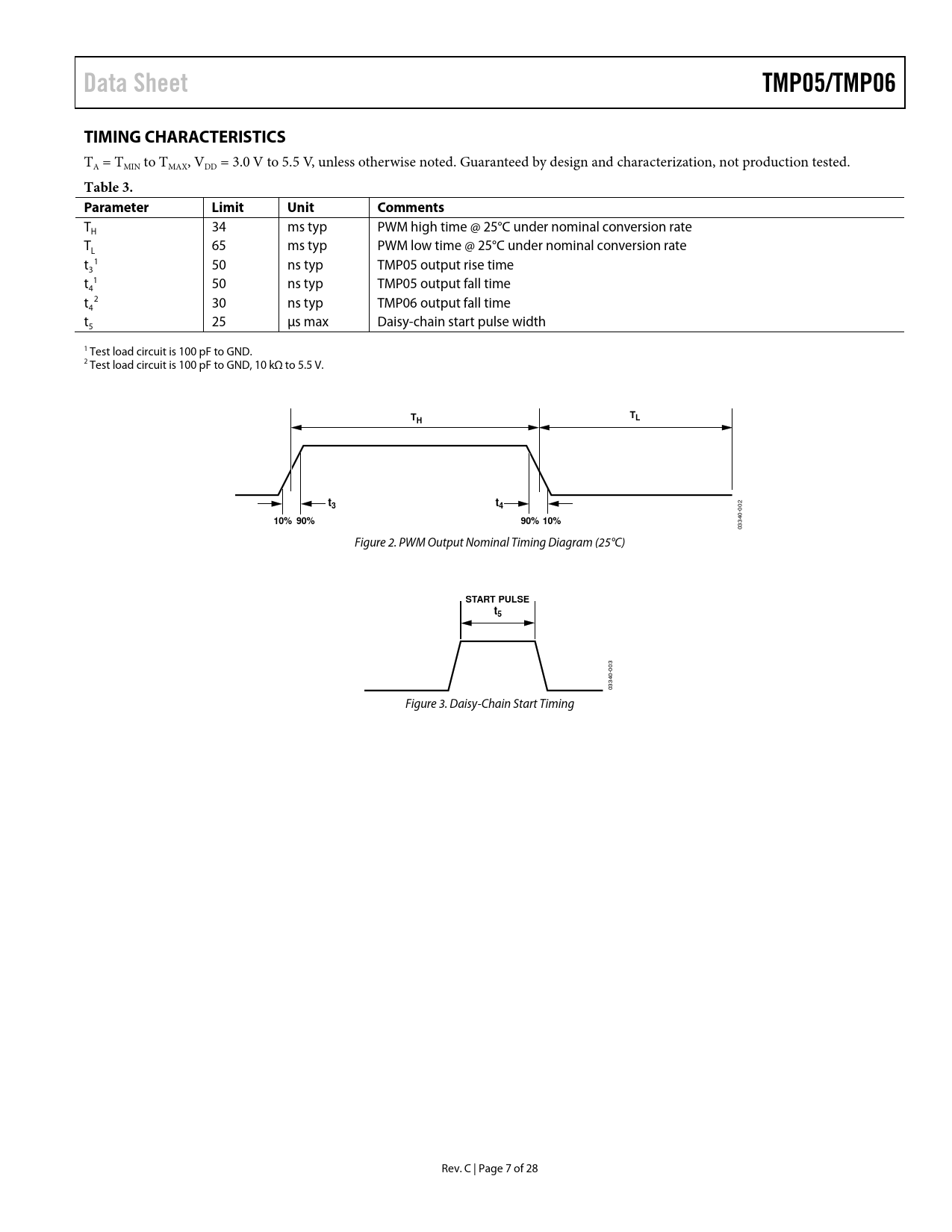 T 34 ms typ PWM high time @ 25°C under nominal conversion rate H T 65 ms typ PWM low time @ 25°C under nominal conversion rate L t 1 50 ns typ TMP05 output rise time 3 t 1 50 ns typ TMP05 output fall time 4 t 2 30 ns typ TMP06 output fall time 4 t 25 µs max Daisy-chain start pulse width 5 1 Test load circuit is 100 pF to GND. 2 Test load circuit is 100 pF to GND, 10 kΩ to 5.5 V.