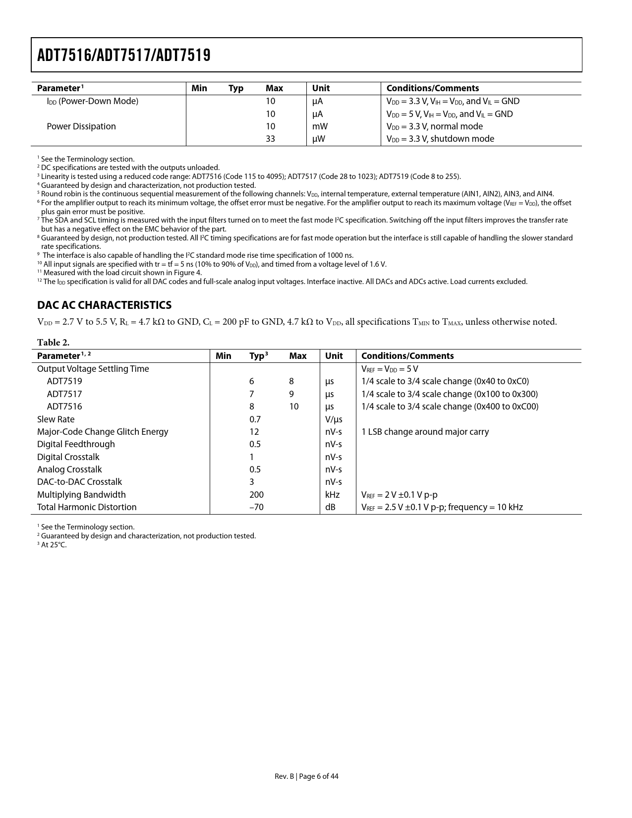 ADT7516/ADT7517/ADT7519 Parameter1 Min Typ Max Unit Conditions/Comments DAC AC CHARACTERISTICS Table 2 Parameter1 , 2 Typ3