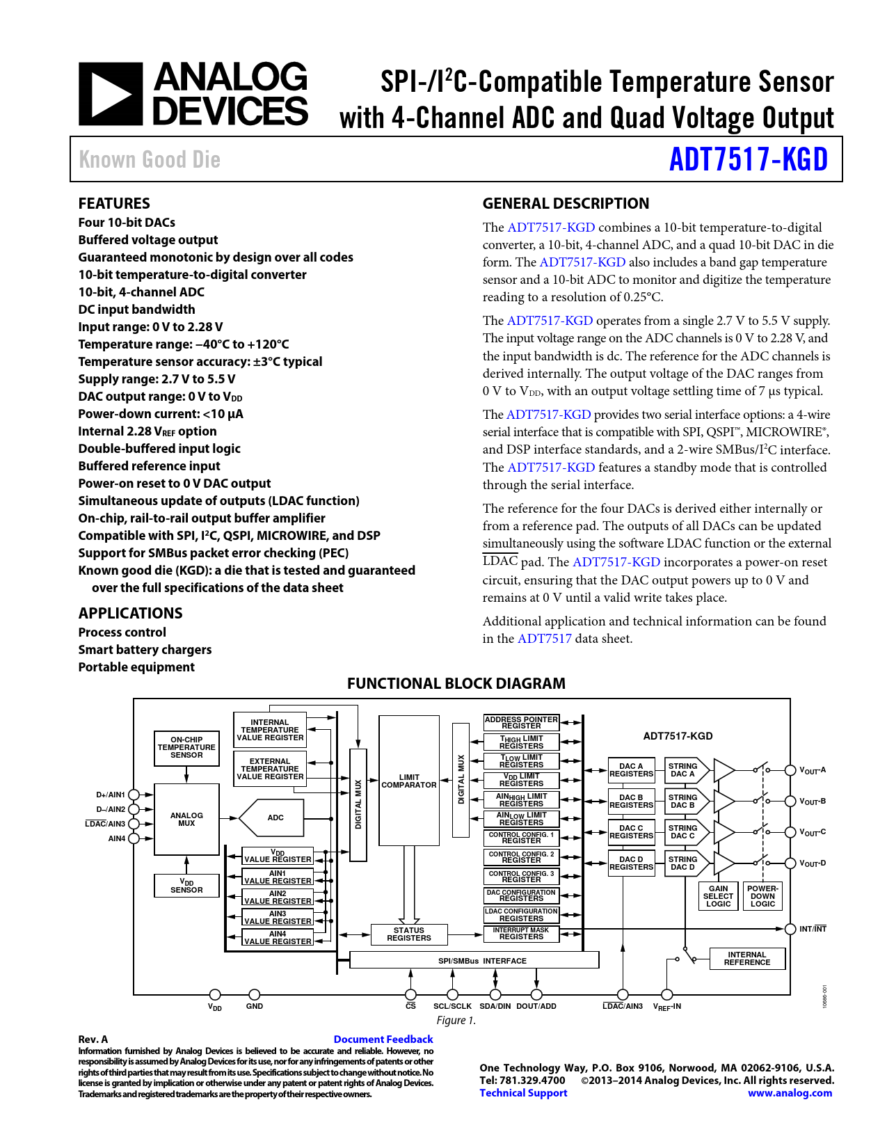 SPI-/I2C-Compatible Temperature Sensor. with 4-Channel ADC and Quad Voltage Output. Known Good Die. ADT7517-KGD. FEATURES