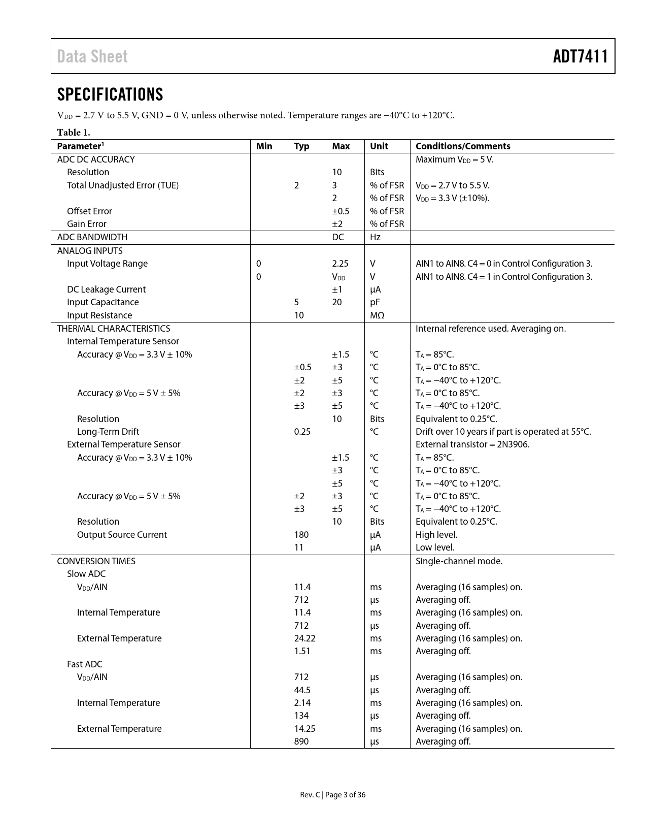 | 页数 / 页 | 36 / 3 — Data Sheet. ADT7411. SPECIFICATIONS. Table 1. Parameter1. Min. Typ. Max. … |
