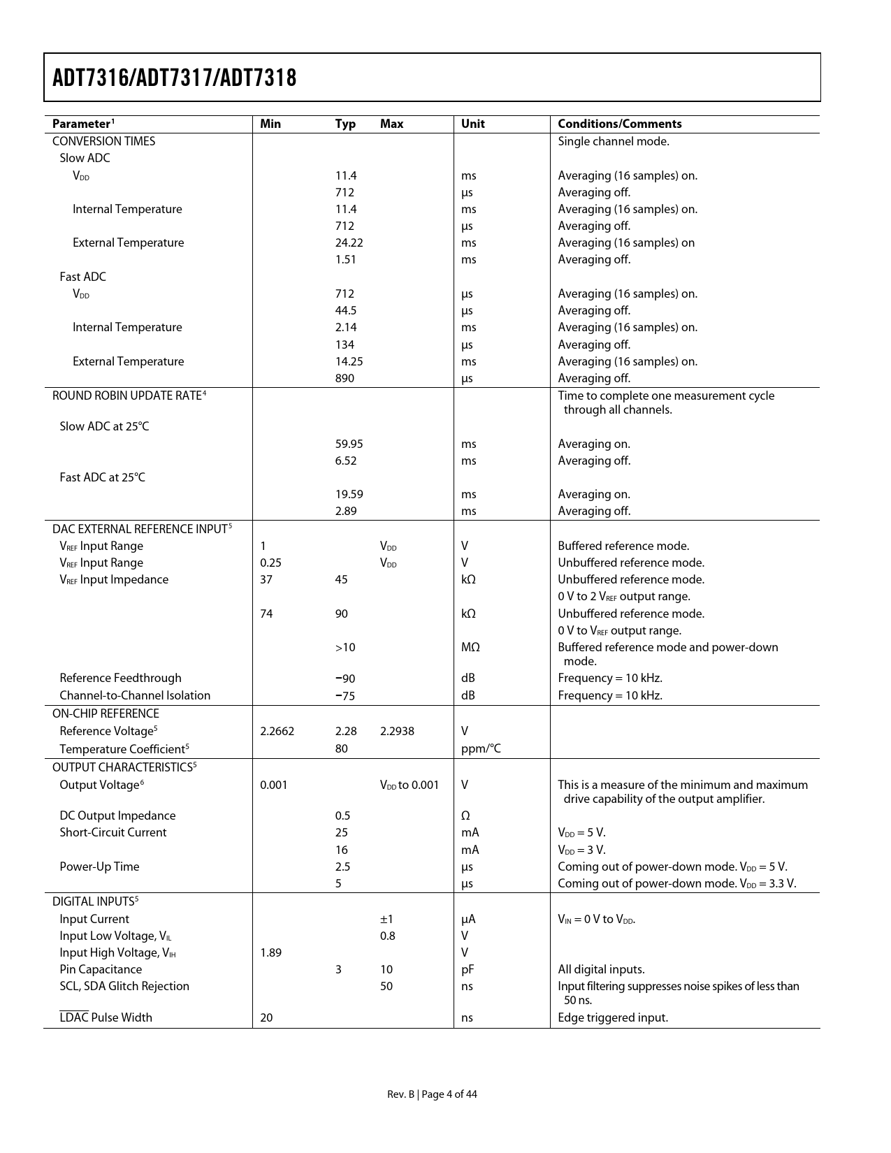 link to page 5 link to page 5 link to page 5 link to page 5 link to page 5 link to page 5 link to page 5 ADT7316/ADT7317/ADT7318Parameter1Min TypMax UnitConditions/Comments CONVERSION TIMES Single channel mode. Slow ADC VDD 11.4 ms Averaging (16 samples) on. 712 μs Averaging off. Internal Temperature 11.4 ms Averaging (16 samples) on. 712 μs Averaging off. External Temperature 24.22 ms Averaging (16 samples) on 1.51 ms Averaging off. Fast ADC VDD 712 μs Averaging (16 samples) on. 44.5 μs Averaging off. Internal Temperature 2.14 ms Averaging (16 samples) on. 134 μs Averaging off. External Temperature 14.25 ms Averaging (16 samples) on. 890 μs Averaging off. ROUND ROBIN UPDATE RATE4 Time to complete one measurement cycle through all channels. Slow ADC at 25°C 59.95 ms Averaging on. 6.52 ms Averaging off. Fast ADC at 25°C 19.59 ms Averaging on. 2.89 ms Averaging off. DAC EXTERNAL REFERENCE INPUT5 VREF Input Range 1 VDD V Buffered reference mode. VREF Input Range 0.25 VDD V Unbuffered reference mode. VREF Input Impedance 37 45 kΩ Unbuffered reference mode. 0 V to 2 VREF output range. 74 90 kΩ Unbuffered reference mode. 0 V to VREF output range. >10 MΩ Buffered reference mode and power-down mode. Reference Feedthrough −90 dB Frequency = 10 kHz. Channel-to-Channel Isolation −75 dB Frequency = 10 kHz. ON-CHIP REFERENCE Reference Voltage5 2.2662 2.28 2.2938 V Temperature Coefficient5 80 ppm/°C OUTPUT CHARACTERISTICS5 Output Voltage6 0.001 VDD to 0.001 V This is a measure of the minimum and maximum drive capability of the output amplifier. DC Output Impedance 0.5 Ω Short-Circuit Current 25 mA VDD = 5 V. 16 mA VDD = 3 V. Power-Up Time 2.5 μs Coming out of power-down mode. VDD = 5 V. 5 μs Coming out of power-down mode. VDD = 3.3 V. DIGITAL INPUTS5 Input Current ±1 μA VIN = 0 V to VDD. Input Low Voltage, VIL 0.8 V Input High Voltage, VIH 1.89 V Pin Capacitance 3 10 pF All digital inputs. SCL, SDA Glitch Rejection 50 ns Input filtering suppresses noise spikes of less than 50 ns. LDAC Pulse Width 20 ns Edge triggered input. Rev. B | Page 4 of 44 Document Outline FEATURES APPLICATIONS PIN CONFIGURATION GENERAL DESCRIPTION TABLE OF CONTENTS REVISION HISTORY SPECIFICATIONS FUNCTIONAL BLOCK DIAGRAM DAC AC CHARACTERISTICS ABSOLUTE MAXIMUM RATINGS ESD CAUTION PIN CONFIGURATION AND FUNCTION DESCRIPTIONS TERMINOLOGY TYPICAL PERFORMANCE CHARACTERISTICS THEORY OF OPERATION POWER-UP CALIBRATION CONVERSION SPEED FUNCTIONAL DESCRIPTION—VOLTAGE OUTPUT DIGITAL-TO-ANALOG CONVERTERS DIGITAL-TO-ANALOG SECTION RESISTOR STRING DAC EXTERNAL REFERENCE INPUTS OUTPUT AMPLIFIER THERMAL VOLTAGE OUTPUT Negative Temperatures Positive Temperatures FUNCTIONAL DESCRIPTION—MEASUREMENT TEMPERATURE SENSOR VDD MONITORING ON-CHIP REFERENCE ROUND ROBIN MEASUREMENT SINGLE-CHANNEL MEASUREMENT TEMPERATURE MEASUREMENT METHOD Internal Temperature Measurement External Temperature Measurement TEMPERATURE VALUE FORMAT Temperature Conversion Formula INTERRUPTS REGISTERS REGISTER DESCRIPTIONS SERIAL INTERFACE SERIAL INTERFACE SELECTION I2C SERIAL INTERFACE Writing to the ADT7316/ADT7317/ADT7318 Writing to the Address Pointer Register for a Subsequent Read Writing Data to a Register Reading Data from the ADT7316/ADT7317/ADT7318 SPI SERIAL INTERFACE Write Operation Read Operation SMBUS/SPI INT/ SMBUS Alert Response LAYOUT CONSIDERATIONS OUTLINE DIMENSIONS ORDERING GUIDE