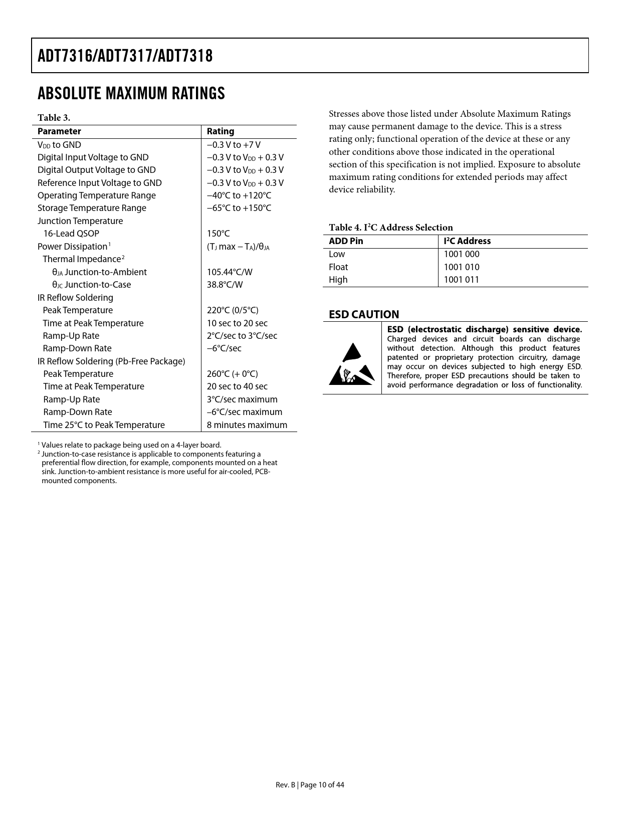 ADT7316/ADT7317/ADT7318. ABSOLUTE MAXIMUM RATINGS. Table 3. Parameter Rating. Table 4. I2C Address Selection. ADD Pin. I2C Address