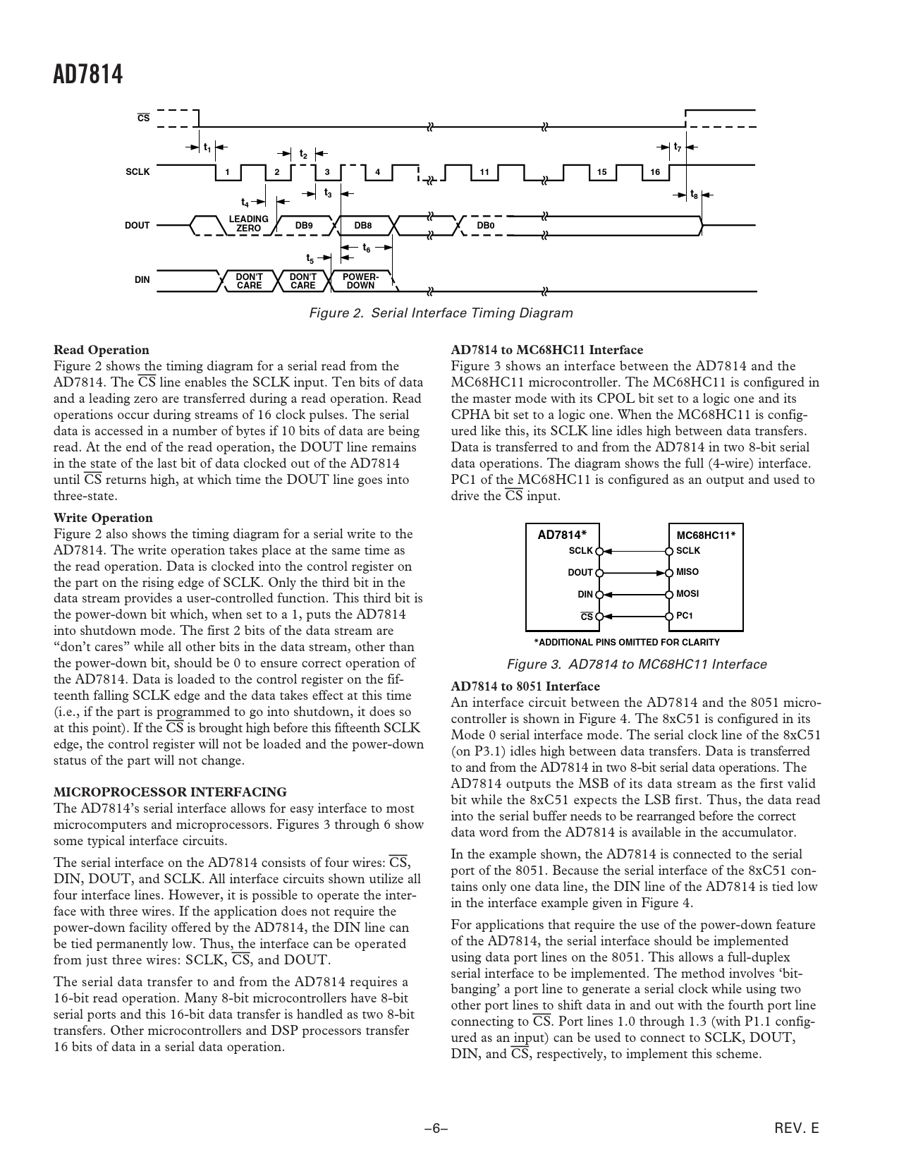 AD7814CSt1tt72SCLK1234111516t3t8t4LEADINGDOUTZERODB9DB8DB0t6t5DINDON'TDON'TPOWER-CARECAREDOWN Figure 2. Serial Interface Timing Diagram Read OperationAD7814 to MC68HC11 Interface Figure 2 shows the timing diagram for a serial read from the Figure 3 shows an interface between the AD7814 and the AD7814. The CS line enables the SCLK input. Ten bits of data MC68HC11 microcontroller. The MC68HC11 is configured in and a leading zero are transferred during a read operation. Read the master mode with its CPOL bit set to a logic one and its operations occur during streams of 16 clock pulses. The serial CPHA bit set to a logic one. When the MC68HC11 is config- data is accessed in a number of bytes if 10 bits of data are being ured like this, its SCLK line idles high between data transfers. read. At the end of the read operation, the DOUT line remains Data is transferred to and from the AD7814 in two 8-bit serial in the state of the last bit of data clocked out of the AD7814 data operations. The diagram shows the full (4-wire) interface. until CS returns high, at which time the DOUT line goes into PC1 of the MC68HC11 is configured as an output and used to three-state. drive the CS input. Write Operation Figure 2 also shows the timing diagram for a serial write to the AD7814*MC68HC11* AD7814. The write operation takes place at the same time as SCLKSCLK the read operation. Data is clocked into the control register on DOUTMISO the part on the rising edge of SCLK. Only the third bit in the data stream provides a user-controlled function. This third bit is DINMOSI the power-down bit which, when set to a 1, puts the AD7814 CSPC1 into shutdown mode. The first 2 bits of the data stream are “don’t cares” while all other bits in the data stream, other than *ADDITIONAL PINS OMITTED FOR CLARITY the power-down bit, should be 0 to ensure correct operation of Figure 3. AD7814 to MC68HC11 Interface the AD7814. Data is loaded to the control register on the fif- AD7814 to 8051 Interface teenth falling SCLK edge and the data takes effect at this time An interface circuit between the AD7814 and the 8051 micro- (i.e., if the part is programmed to go into shutdown, it does so controller is shown in Figure 4. The 8xC51 is configured in its at this point). If the CS is brought high before this fifteenth SCLK Mode 0 serial interface mode. The serial clock line of the 8xC51 edge, the control register will not be loaded and the power-down (on P3.1) idles high between data transfers. Data is transferred status of the part will not change. to and from the AD7814 in two 8-bit serial data operations. The AD7814 outputs the MSB of its data stream as the first valid MICROPROCESSOR INTERFACING bit while the 8xC51 expects the LSB first. Thus, the data read The AD7814’s serial interface allows for easy interface to most into the serial buffer needs to be rearranged before the correct microcomputers and microprocessors. Figures 3 through 6 show data word from the AD7814 is available in the accumulator. some typical interface circuits. In the example shown, the AD7814 is connected to the serial The serial interface on the AD7814 consists of four wires: CS, port of the 8051. Because the serial interface of the 8xC51 con- DIN, DOUT, and SCLK. All interface circuits shown utilize all tains only one data line, the DIN line of the AD7814 is tied low four interface lines. However, it is possible to operate the inter- in the interface example given in Figure 4. face with three wires. If the application does not require the power-down facility offered by the AD7814, the DIN line can For applications that require the use of the power-down feature be tied permanently low. Thus, the interface can be operated of the AD7814, the serial interface should be implemented from just three wires: SCLK, CS, and DOUT. using data port lines on the 8051. This allows a full-duplex serial interface to be implemented. The method involves ‘bit- The serial data transfer to and from the AD7814 requires a banging’ a port line to generate a serial clock while using two 16-bit read operation. Many 8-bit microcontrollers have 8-bit other port lines to shift data in and out with the fourth port line serial ports and this 16-bit data transfer is handled as two 8-bit connecting to CS. Port lines 1.0 through 1.3 (with P1.1 config- transfers. Other microcontrollers and DSP processors transfer ured as an input) can be used to connect to SCLK, DOUT, 16 bits of data in a serial data operation. DIN, and CS, respectively, to implement this scheme. –6– REV. E Document Outline FEATURES FUNCTIONAL BLOCK DIAGRAM GENERAL DESCRIPTION PRODUCT HIGHLIGHTS SPECIFICATIONS TIMING CHARACTERISTICS ABSOLUTE MAXIMUM RATINGS ORDERING GUIDE PIN FUNCTION DESCRIPTIONS PIN CONFIGURATIONS CIRCUIT INFORMATION CONVERTER DETAILS TEMPERATURE VALUE REGISTER SERIAL INTERFACE Read Operation Write Operation MICROPROCESSOR INTERFACING AD7814 to MC68HC11 Interface AD7814 to 8051 Interface AD7814 to PIC16C6x/7x Interface AD7814 to ADSP-21xx Interface MOUNTING THE AD7814 SUPPLY DECOUPLING OUTLINE DIMENSIONS Revision History