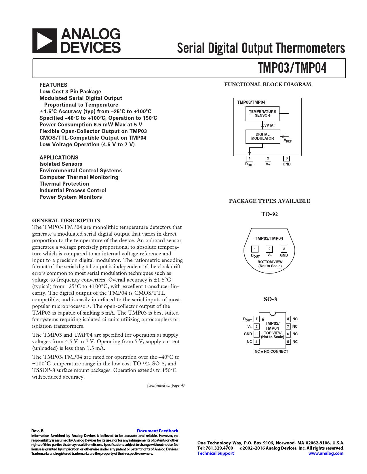 The TMP03/TMP04 are rated for operation over the –40°C to +100°C temperature range in the low cost TO-92, SO-8, and TSSOP-8 surface mount packages. Operation extends to 150°C with reduced accuracy. (continued on page 4)